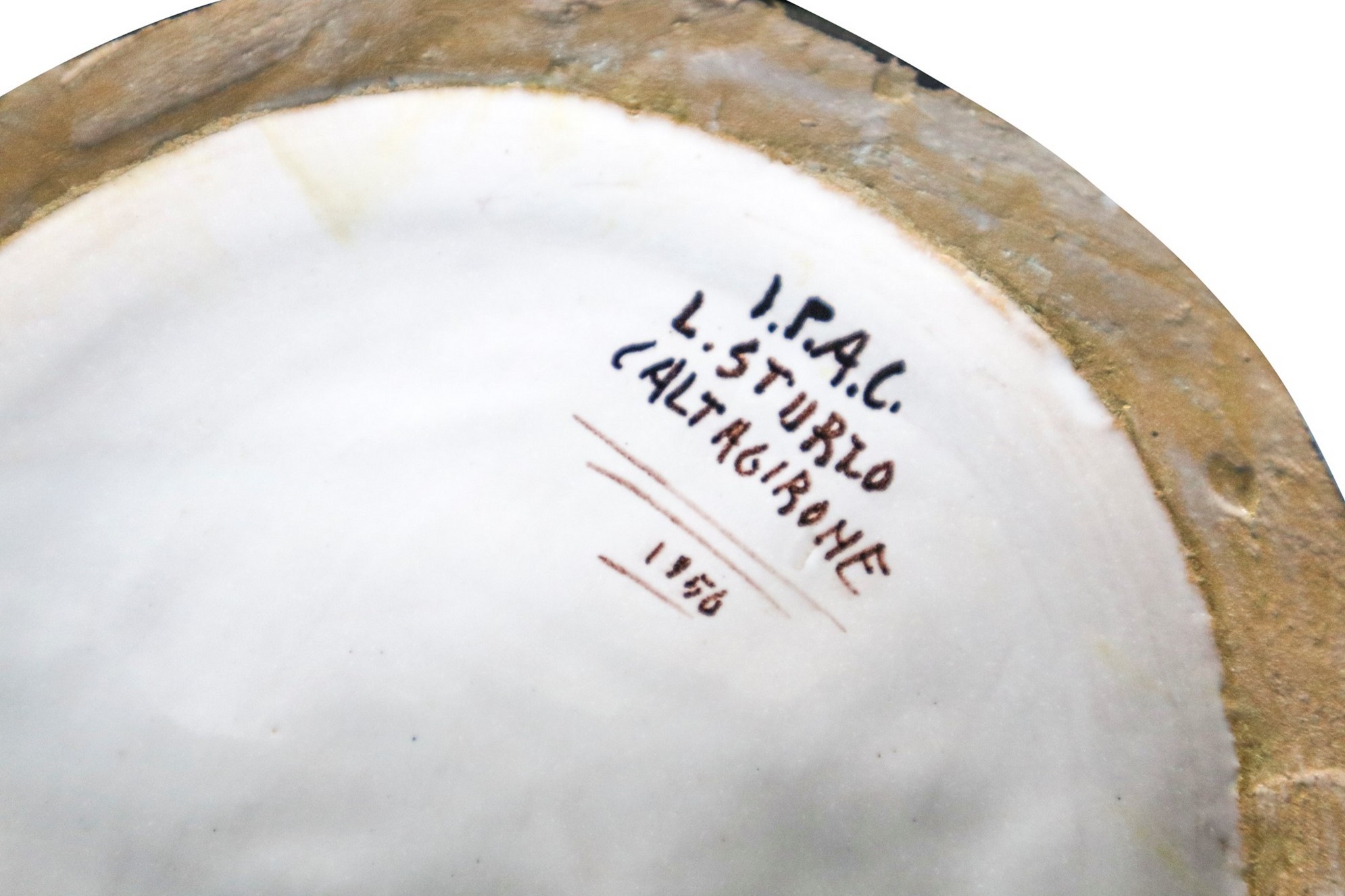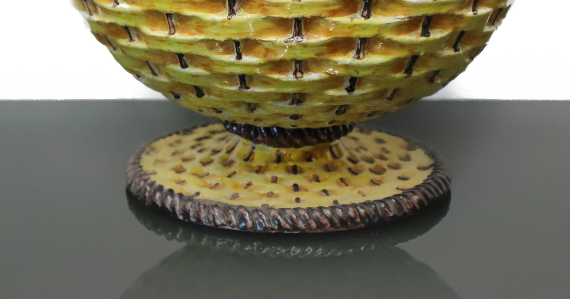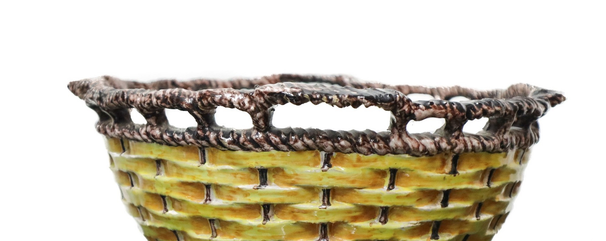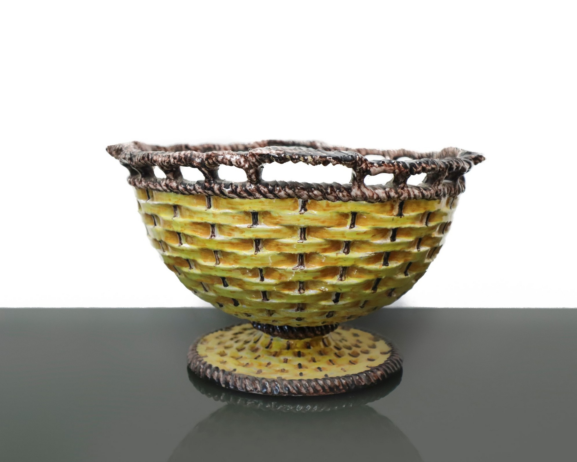 Cesto in maiolica di Caltagirone, 1956 h cm 15 x diamtetro cm 25 Color giallo e manganese, firmato alla base I.P.A.C. L.Sturzo.