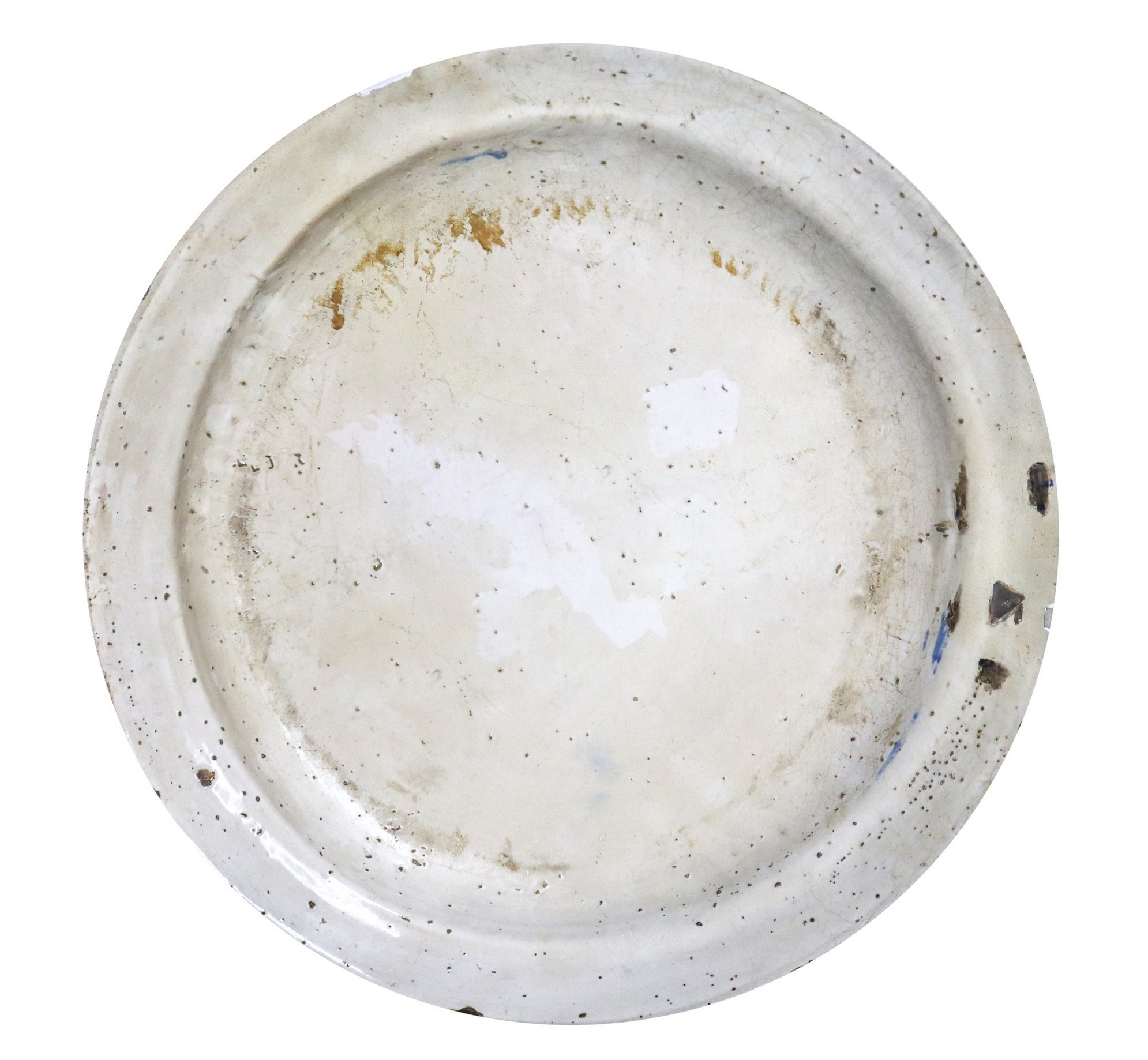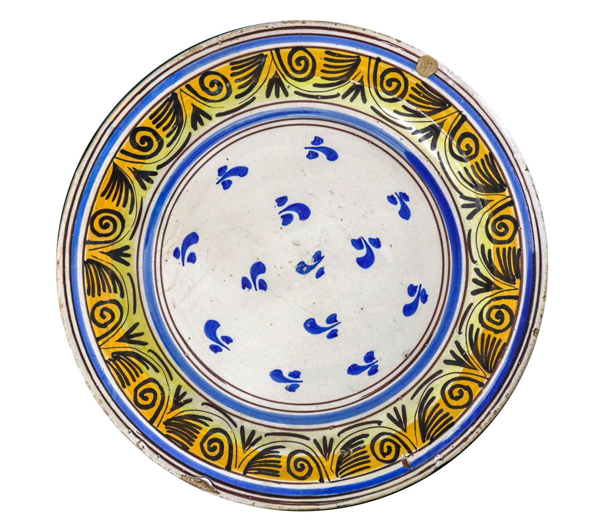 Piatto in maiolica di Caltagirone, Late 18th century Diametro cm 45 Centrale con foglie blu su base bianca. Giallo, blu e manganese sulla circonferenza.
