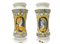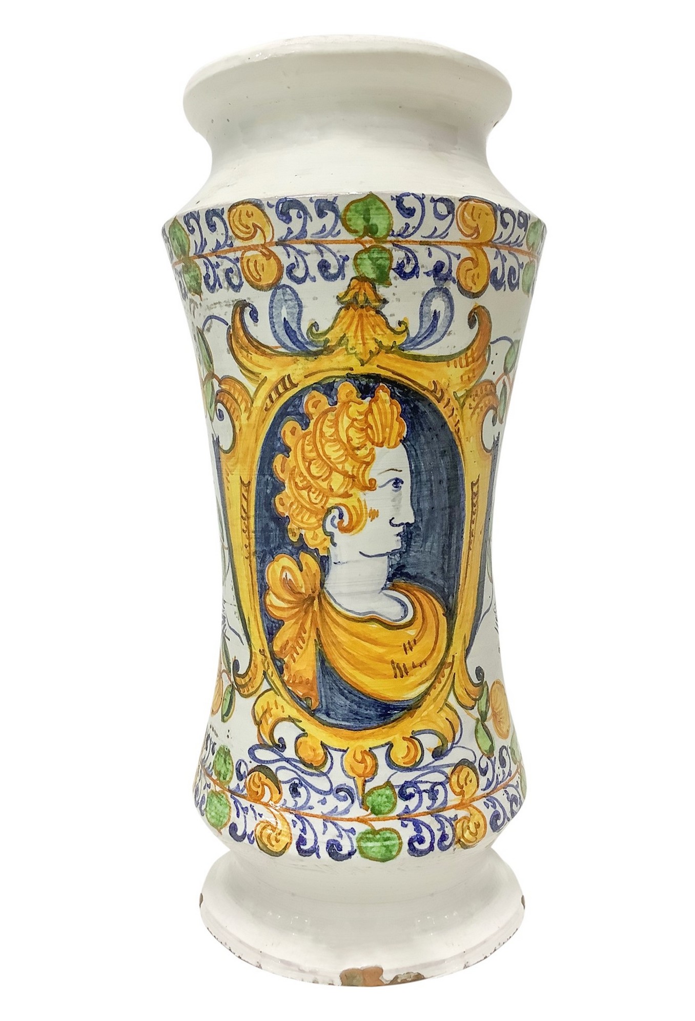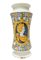 Lotto 125 | Coppia di albarelli in maiolica policroma con personaggio sul davanti su base bianca, 20th century