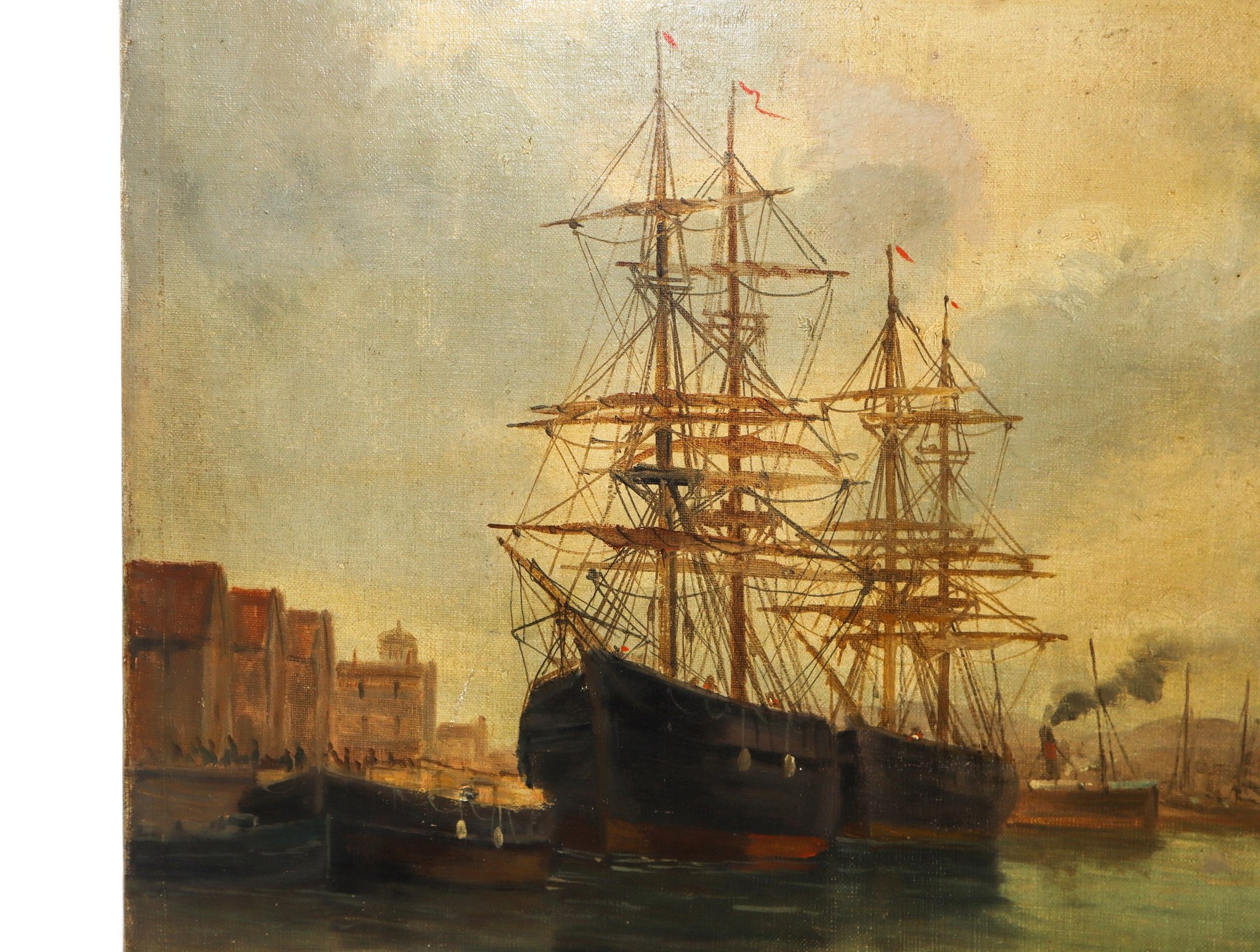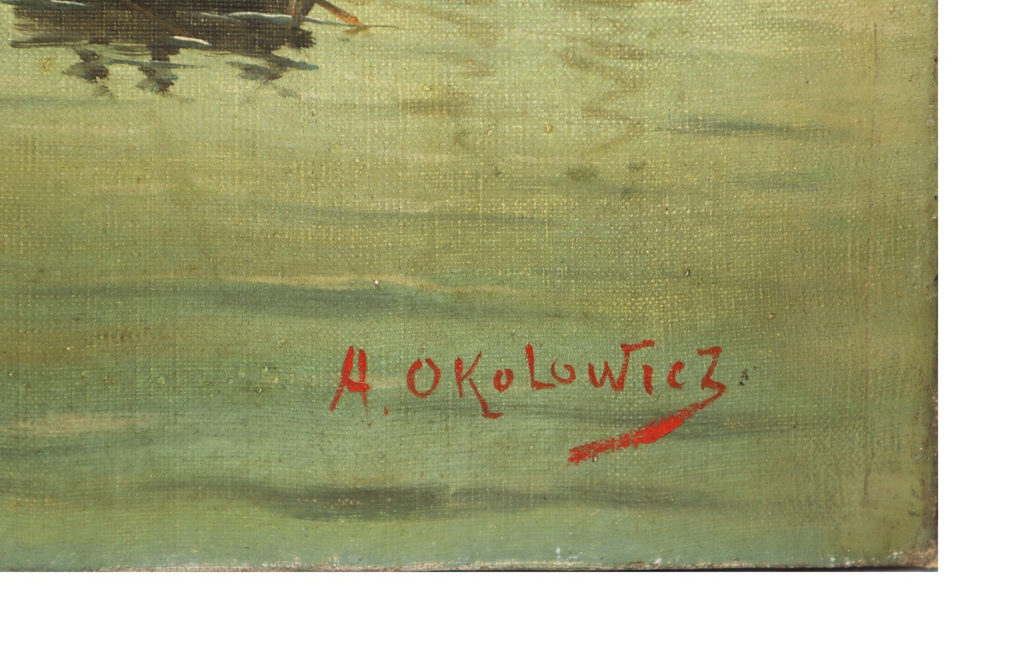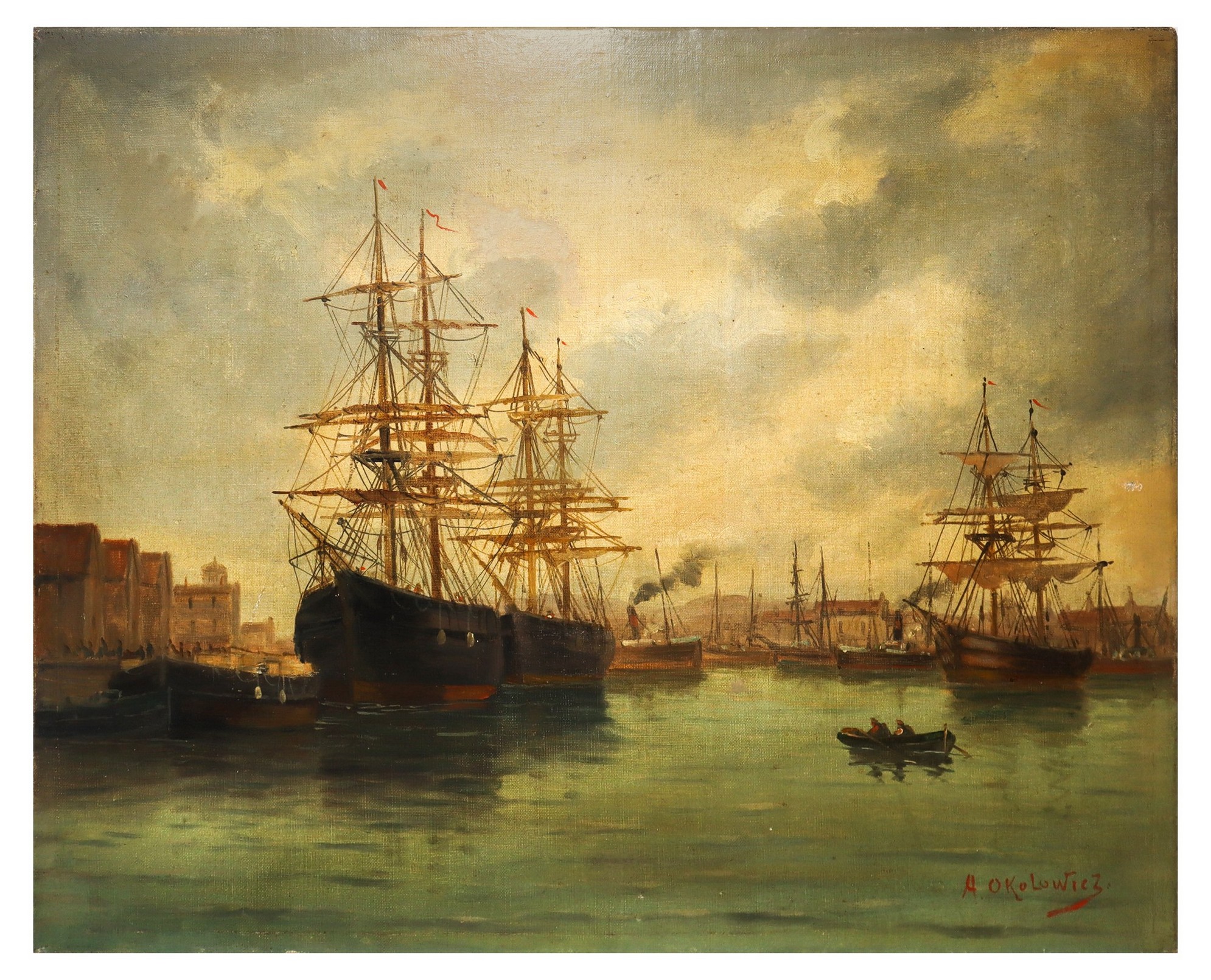 Nikolaj Alexandrowitsch Okolowicz (1867-1928) - Vascelli in rada cm 46 x cm 55 Dipinto ad olio su tela Firmato in basso a destra. Opera sprovvista di cornice.