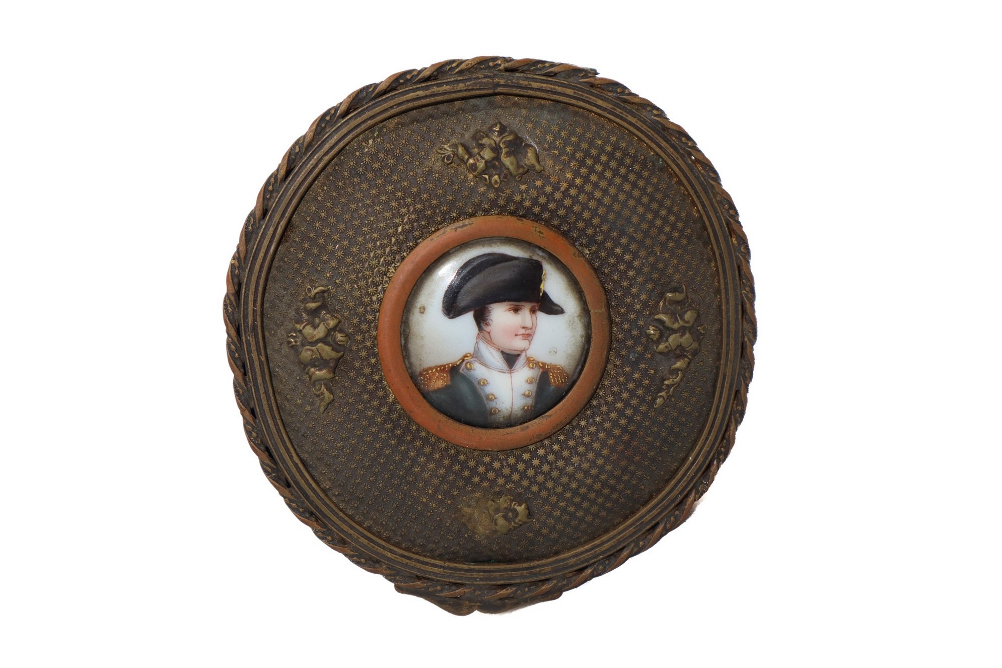 Scatola rotonda in ottone dorato con miniatura di Napoleone , 19th century H cm 4, diametro 9,5 cm Con porcellana centrale al coperchio raffigurante Napoleone I in uniforme