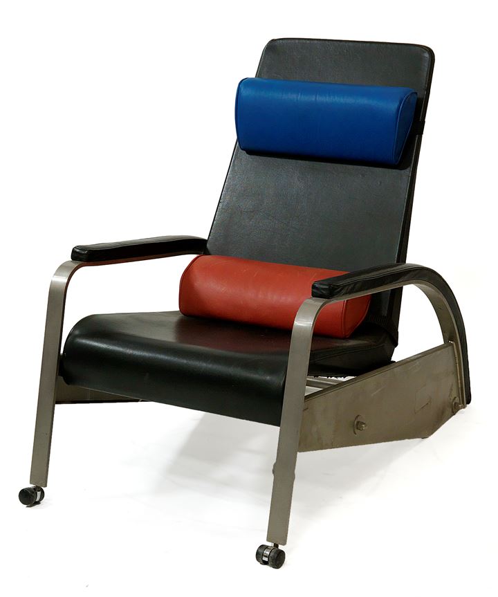 Poltrona reclinabile in metallo con rivestimento in pelle.