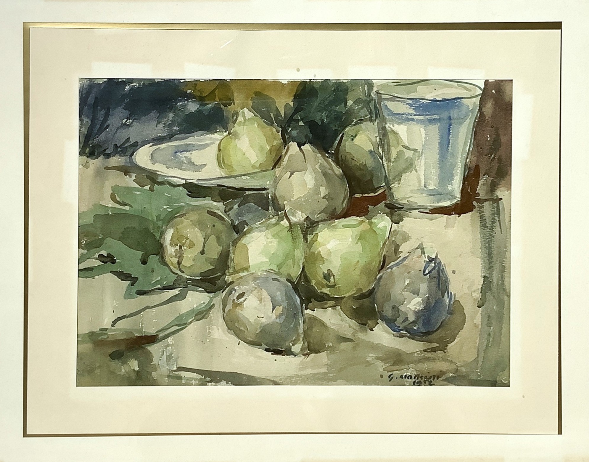 Giovanni Mancini (Foggia 1902-Manfredonia 1984) - Natura morta con pere e stoviglie, 1952 H 51cm x Base 61 cm. In cornice: H 58 cm x Base 68 cm Acquerello su cartoncino Firmato e datato in basso a destra "G. Mancini 1952".