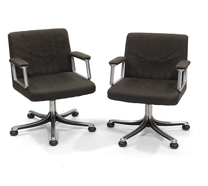 Due poltrone girevoli in fusione di alluminio con rivestimento in tessuto.