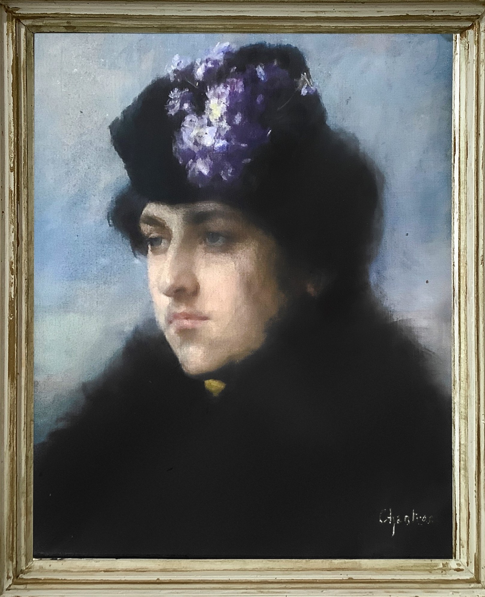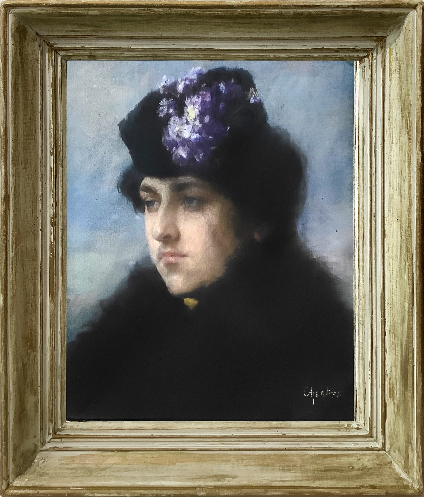 Alexandre Jacques Chantron (Nantes 1842-Nantes 1918) - Ritratto di donna con cappello floreale, nineteenth century 38x29, 5 cm, in cornice 53x44 Pastello su tela applicata a tavoletta Alexandre Jacques Chantron è stato un pittore francese della metà dell’Ottocento. Originario di Nantes, dopo aver concluso gli studi si trasferì a Parigi per iniziare la carriera di pittore sotto la guida di François-Édouard Picot, Tony Robert-Fleury e di William-Adolphe Bouguereau. Nelle sue opere raffigurano principalmente ritratti e nudi e si cimentò anche nella fotografica che andava sempre più affermandosi in quegli anni.