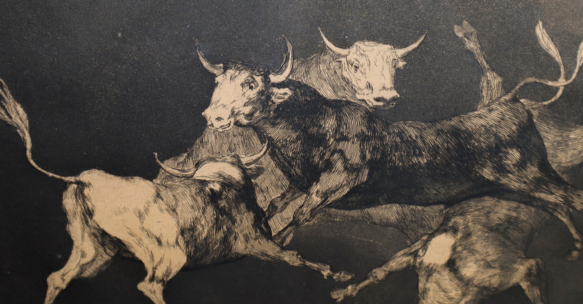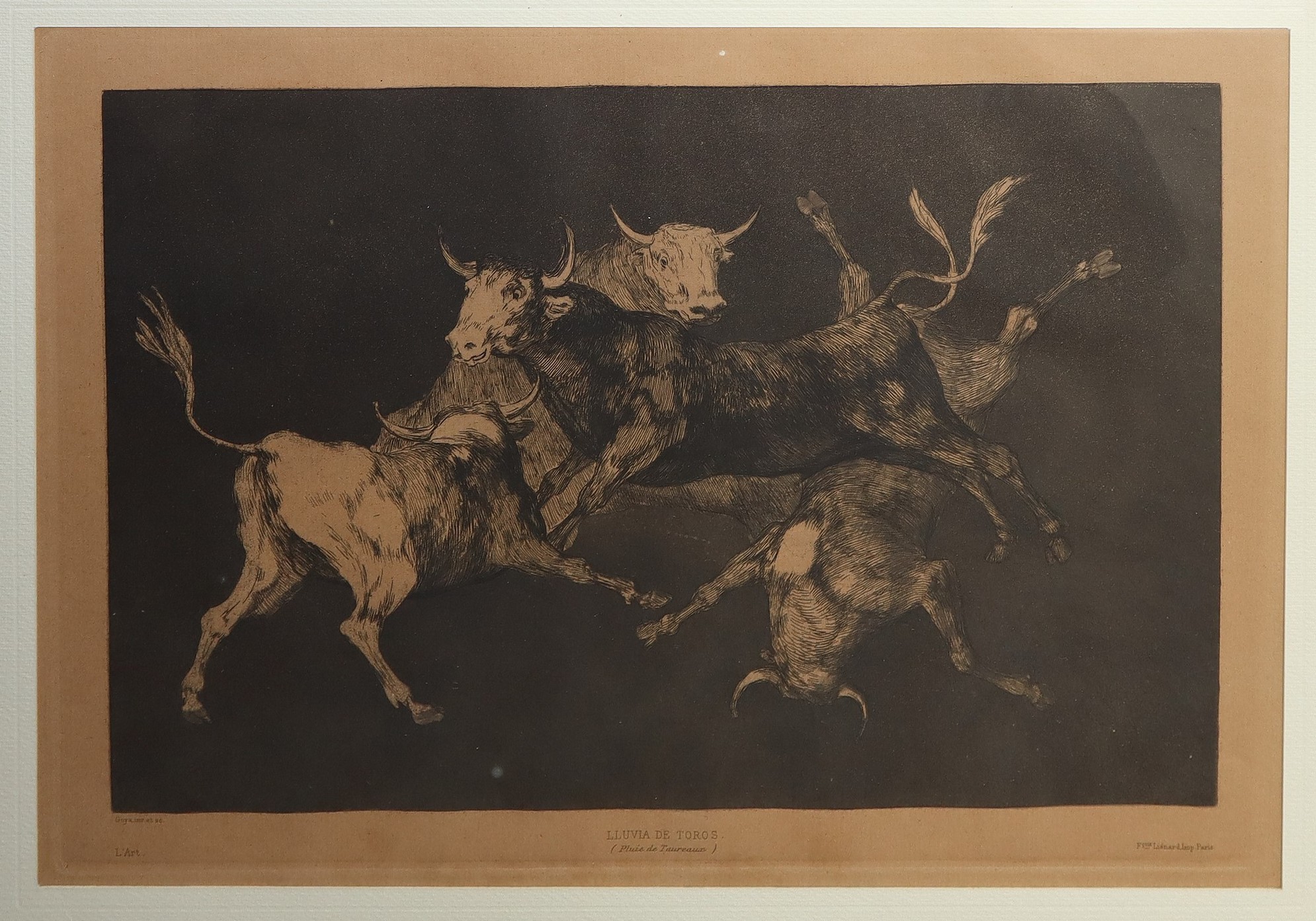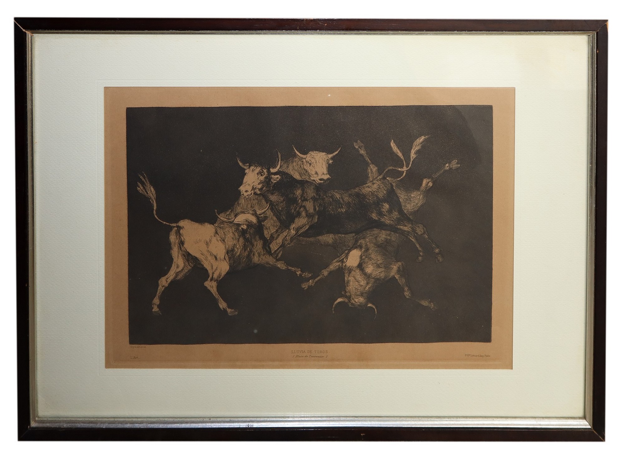 Francisco de Goya (Spanish 1746-1828) - ''Lluvia de toros'' mm 241 x mm 350, in cornice cm 37 x cm 52. Incisione ad acquaforte e acquatinta Serie aggiuntiva ''Los Proverbios'' stampate per la prima volta a Parigi nel 1877.