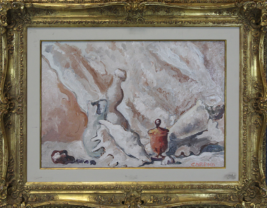 FELICE CARENA, "Natura morta", Anni '60, Olio su tavola,Dim. 39,2x55,8, Al fronte: firmato in basso a destra, Opera archiviata presso l'archivio Luigi Cavallo in data 01/05/2005, Opera con cornice