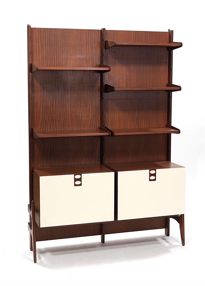 Libreria in legno di teak con cinque piani regolabili in altezza e due mobiletti apribili a ribalta con fronte rivestito in laminato plastico.