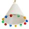 Lampada a sospensione in vetro bianco con filo in vetro cristallo e applicazioni in vetro policromo sul bordo.