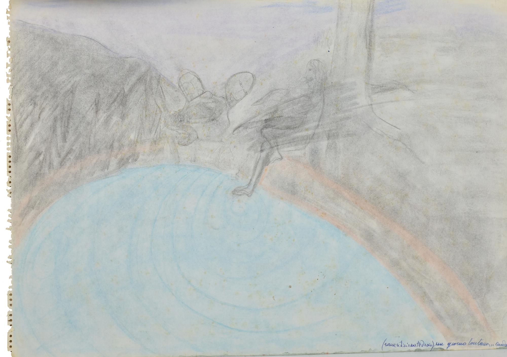 Dando UN GIORNO LONTANO tecnica mista su carta, cm 34,7x50,2 firma, titolo e...