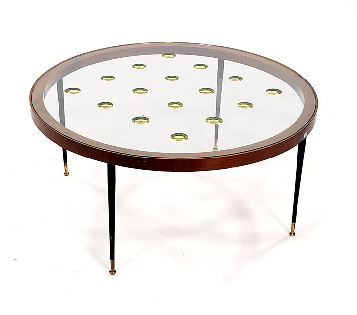 Tavolino con piano in cristallo di forte spessore con lenti scavate e dorate.