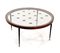 Bordo perimetrale in noce, gambe in metallo laccate con vernice raggrinzante e puntali in ottone.