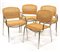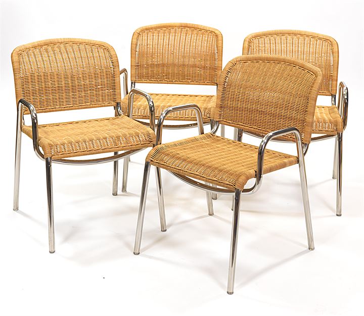 Quattro poltroncine impilabili in tubo metallico, rara versione con seduta impagliata.