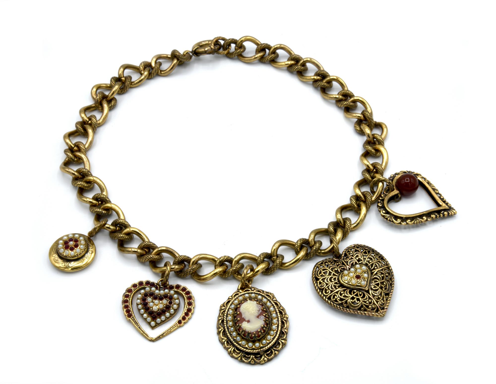 GIROCOLLO IN METALLO DORATO CON CIONDOLI A CUORE E CAMMEO CENTRALE
