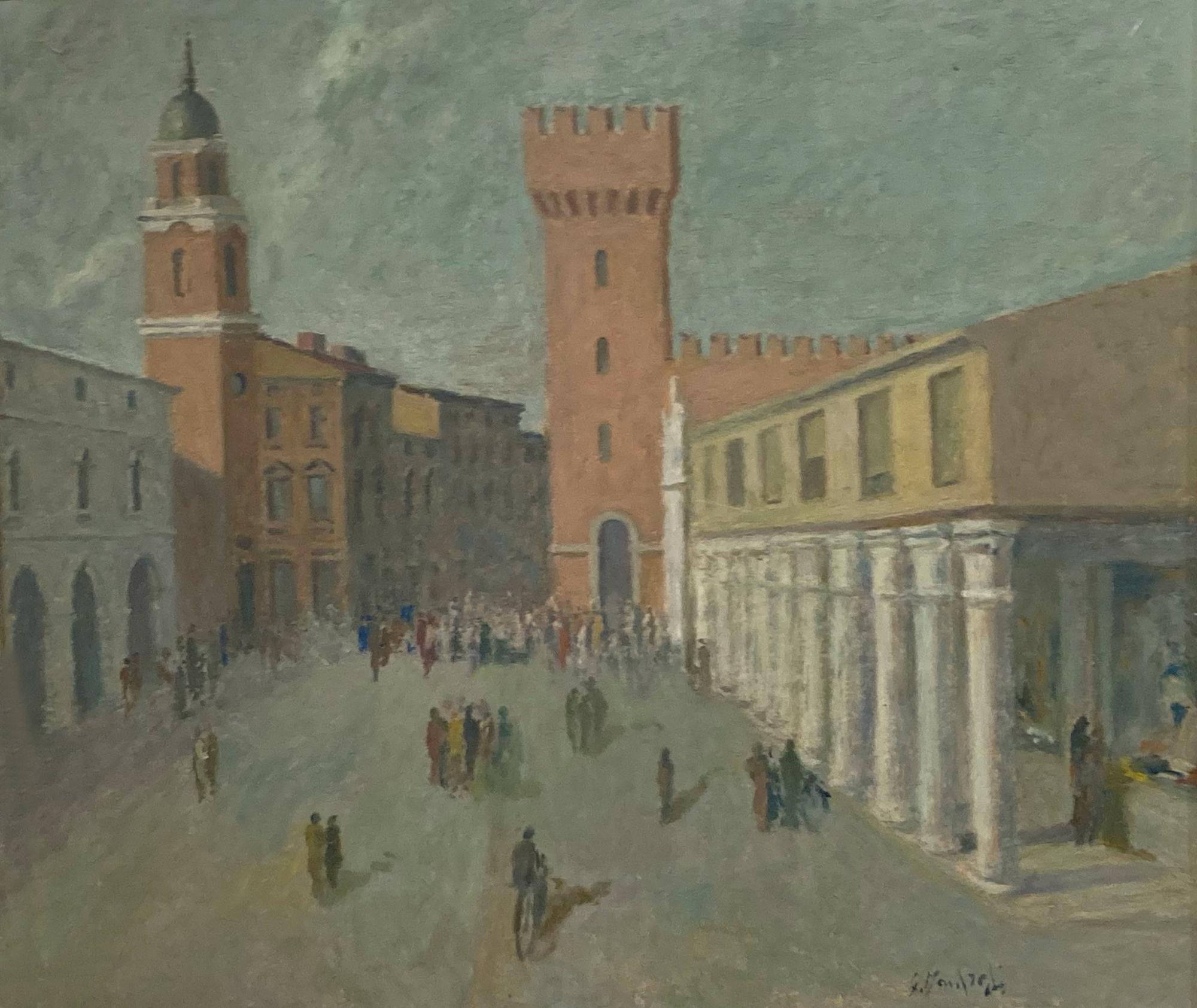 Giuseppe Manfredi LISTONE DI FERRARA olio su cartone, cm 59x67 firma