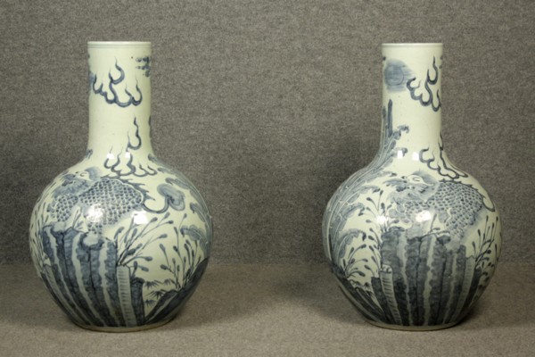 Lotto 373 | Coppia di vasi a bolla in porcella bianca e blu con decori raff. ''ANIMALI...