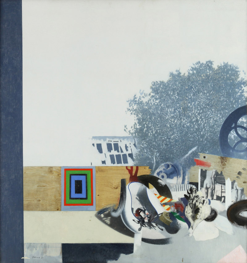 GIANFRANCO FERRONI (1927-2001) Oggetti e paesaggio 1975 olio su tela cm 97x74 firmato e datato in basso a sinistra e sul retro Oggetti e paesaggio 1975 oil on canvas inch 38,22x29,16 signed and dated lower left and on the reverse