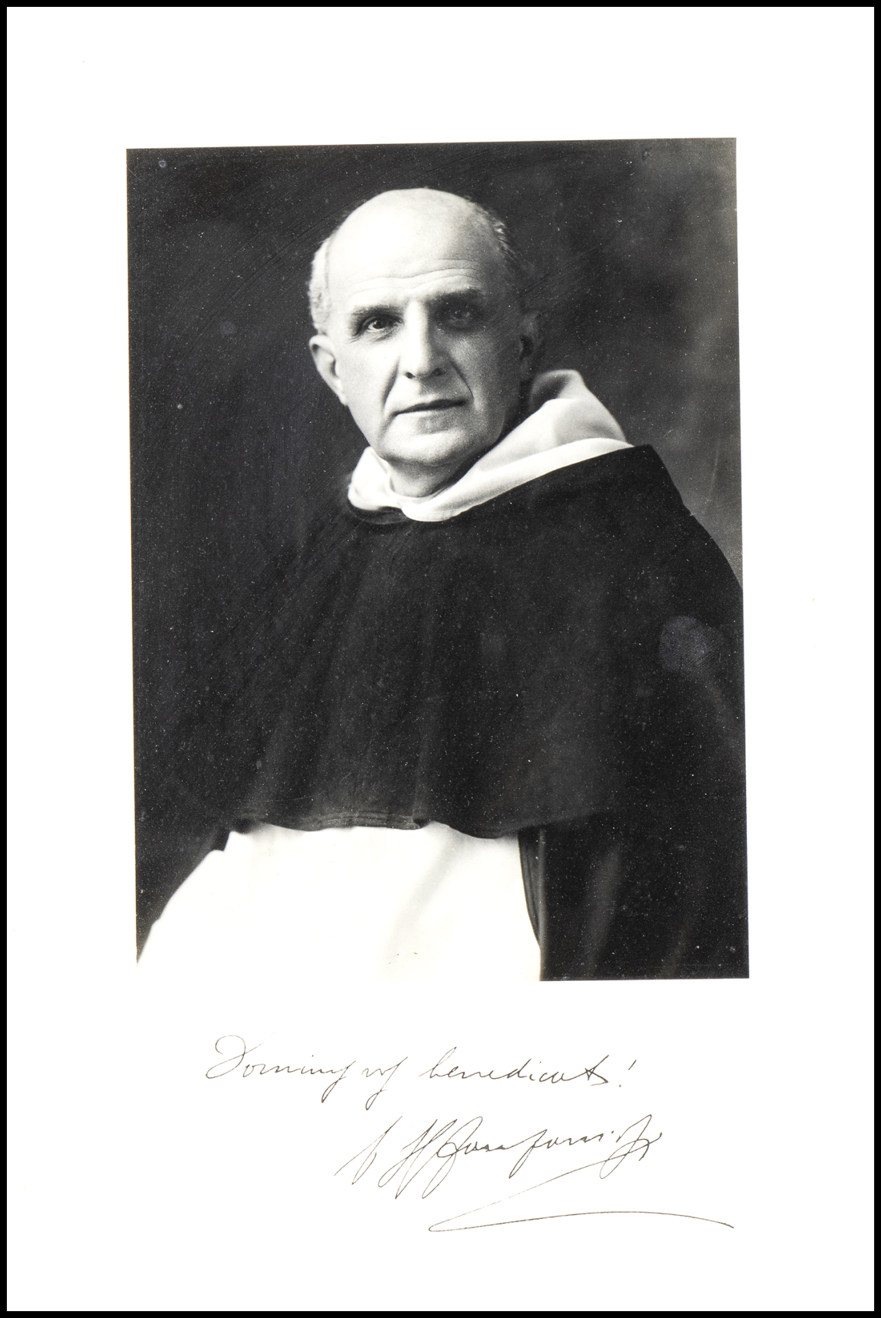 Personaggio in abiti da abate monastico, foto b/n con dedica e firma autografa in inchiostro nero. Foto con timbro a secco FELICI ROMA