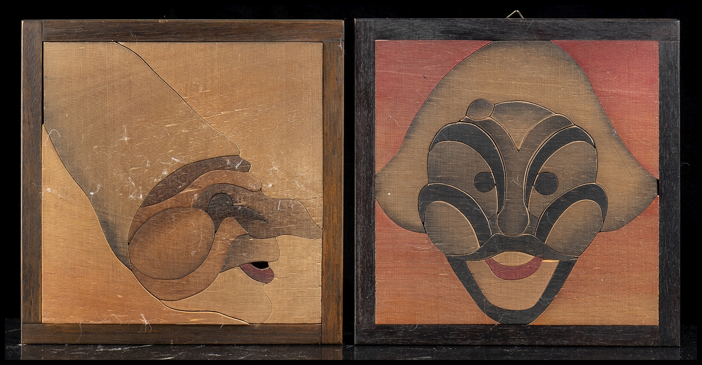 Composizione ad incastro, tasselli in legno policromo, raffiguranti Pulcinella ed Arlecchino