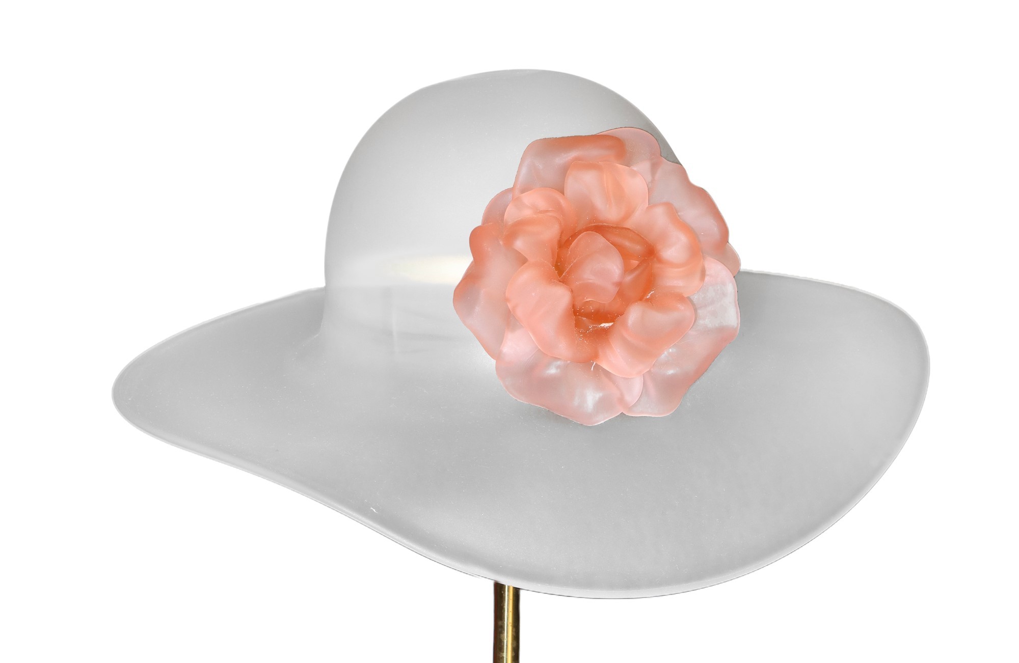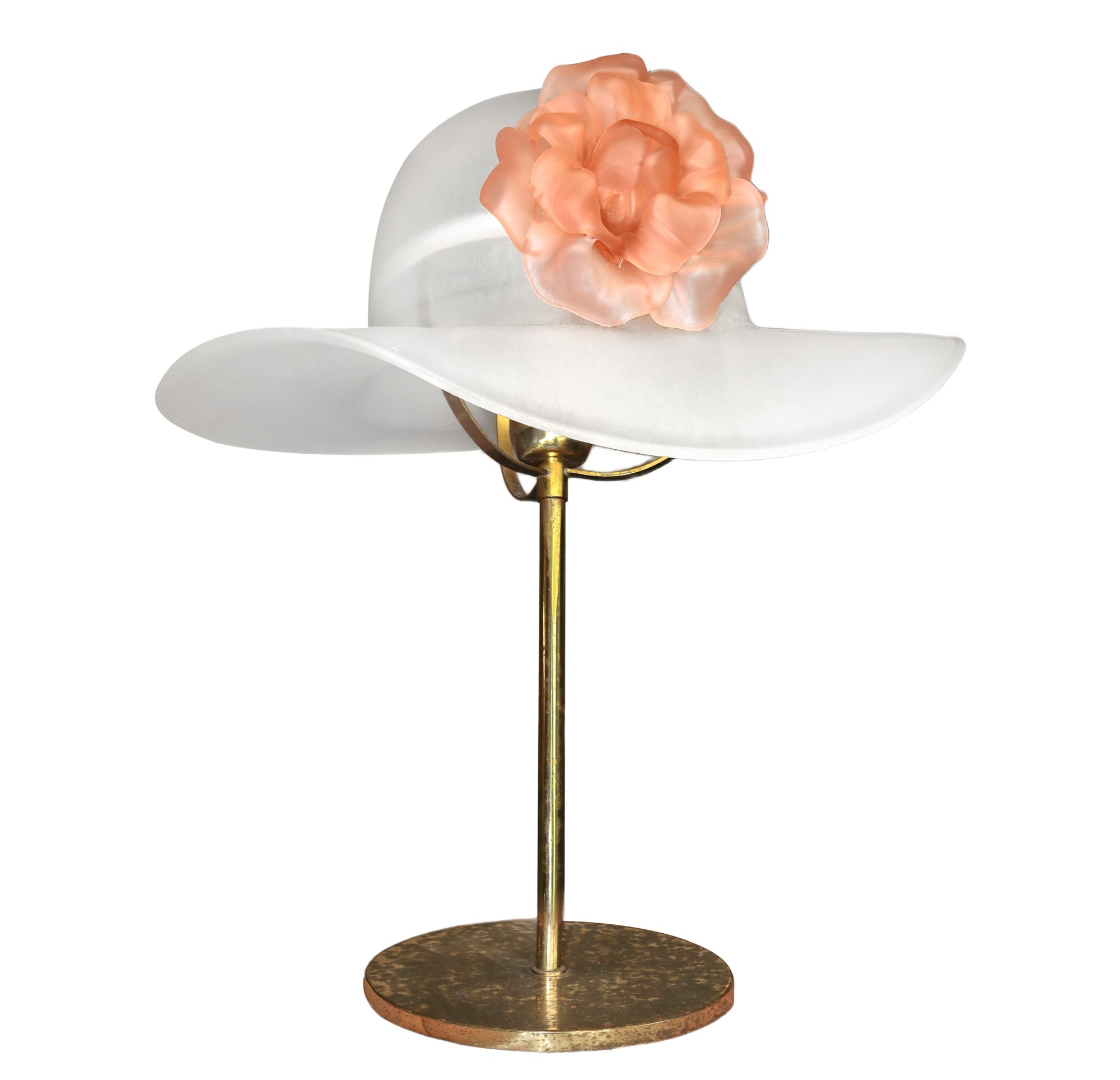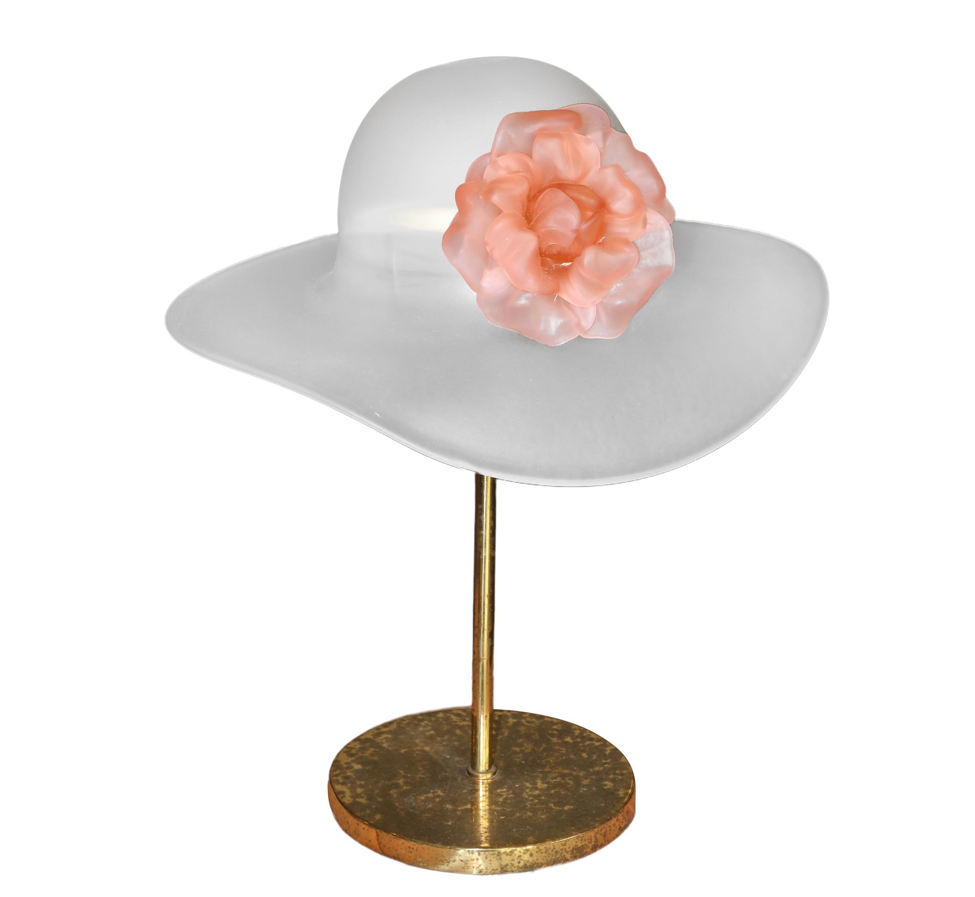 Lampada da tavolo raffigurante cappello con fiore in vetro, 1980s h cm 45 x L cm 37 Stelo metallo dorato