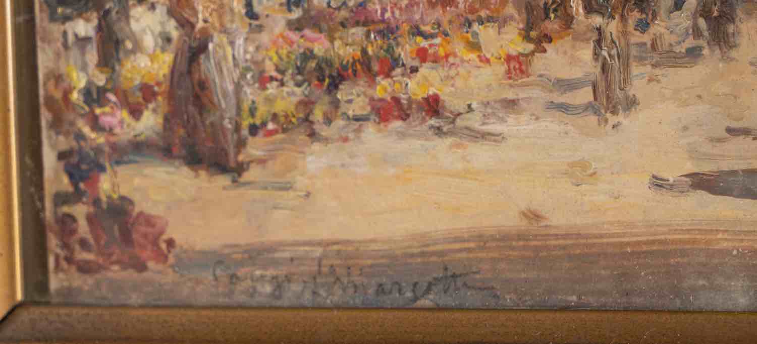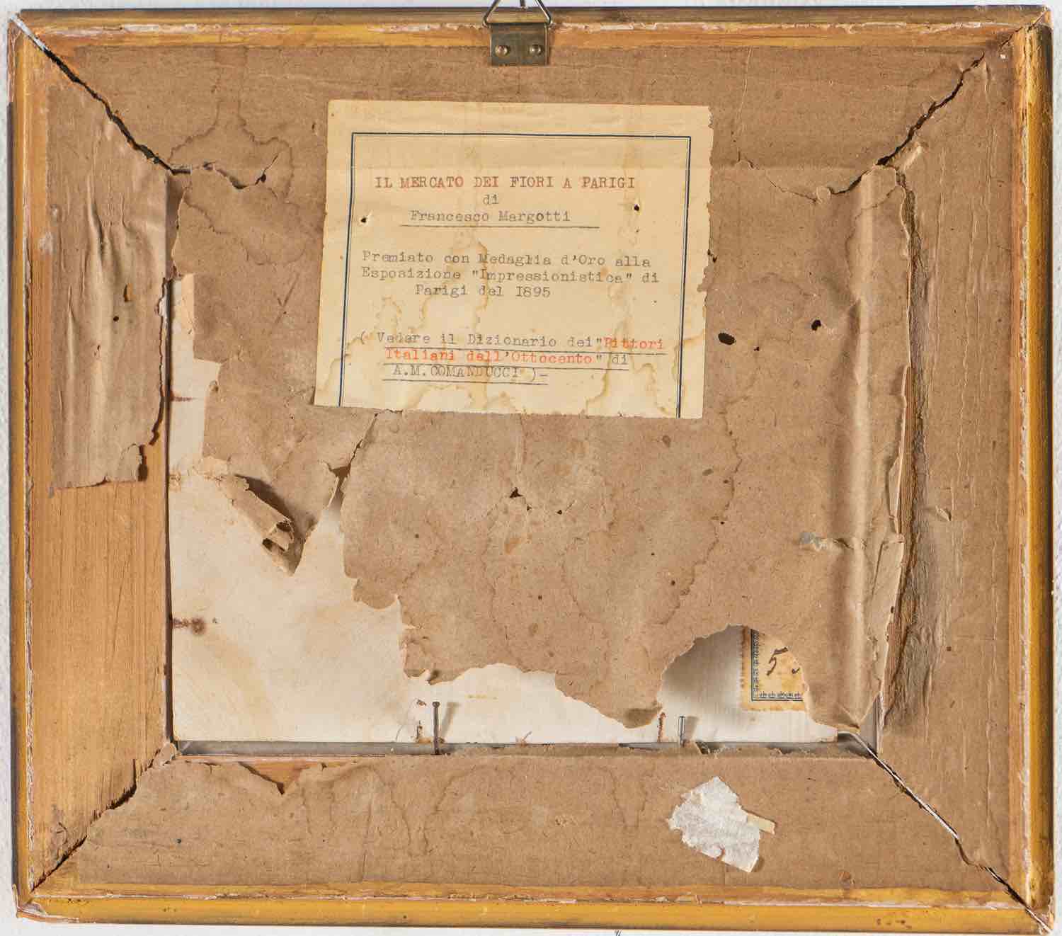 Olio su cartone, reca in basso a destra iscrizione “Parigi F Margotti”, al retro titolo e firma dell’artista, presenta etichetta con autore e titolo “Il mercato dei fiori a Parigi/di/Francesco Margotti/Premiato con Medaglia d’Oro alla/Esposizione “Impressionistica” di/Parigi del 1895/(Vedere il Dizionario dei “Pittori/Italiani dell’Ottocento” di/A. M. Comanducci)”, H cm 16.5x19.5 – con cornice H cm 27x30.5