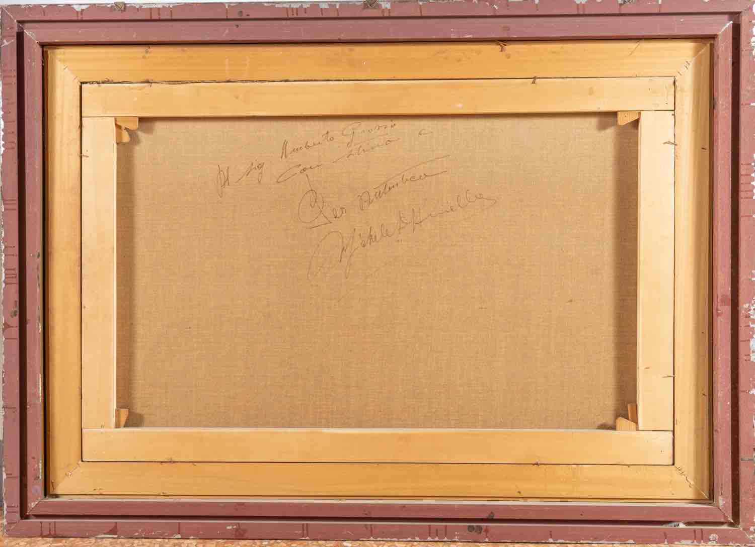 Olio su tela, firmato in basso a destra, reca al retro dedica, iscrizione per autentica e firma dell’artista, H cm 80x130 – con cornice H cm 106.5x157.5