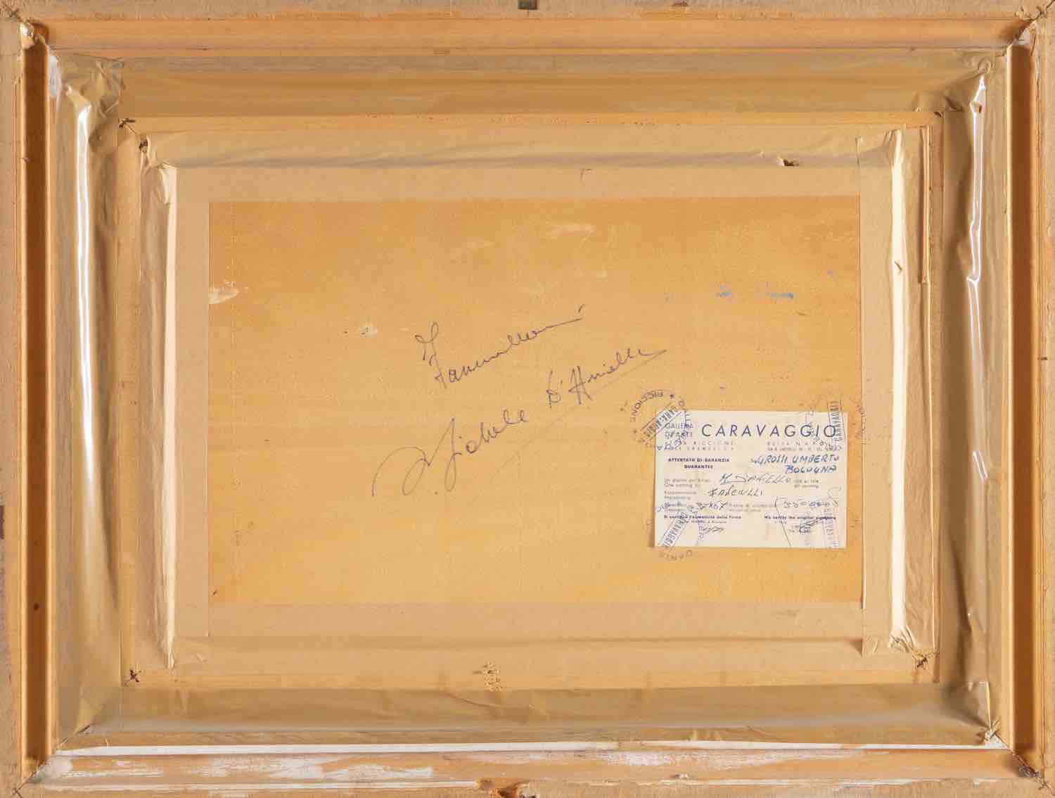Olio su tela, firmato in basso a destra, reca al retro titolo e firma ed etichetta e timbri della Galleria d’Arte Caravaggio con autore, titolo, dimensioni, H cm 37x57