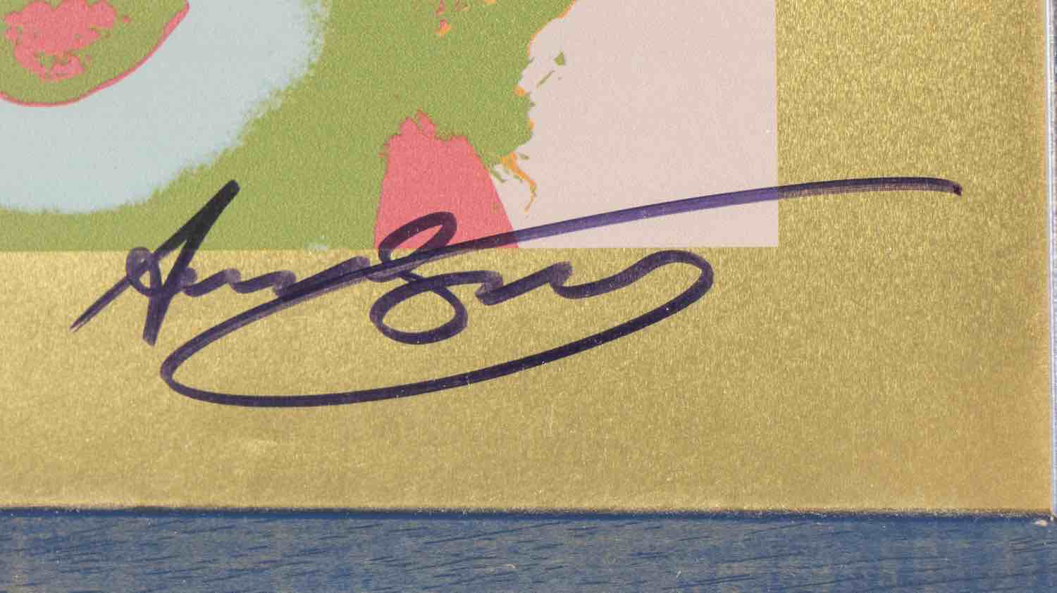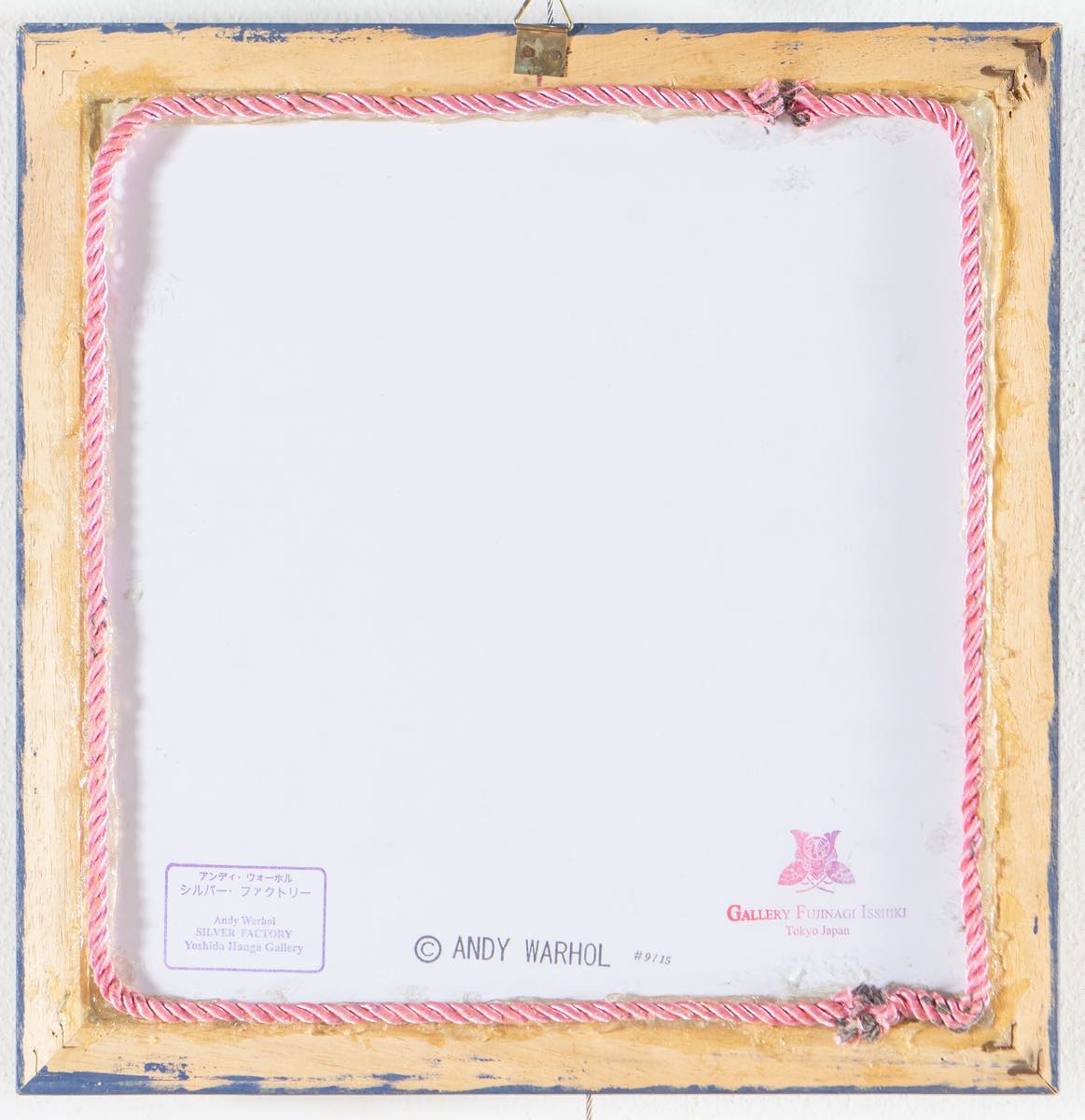 Serigrafia a colori su carta, firmata in basso a destra Andy Warhol”, reca al retro timbro “Andy Warhol” con numero di tiratura 9/15 e timbri “Andy Warhol/SILVER FACTORY/Yoshida Hanga Gallery” e “Gallery Fujinagi Isshiki/Tokio Japan”, H cm 25x25