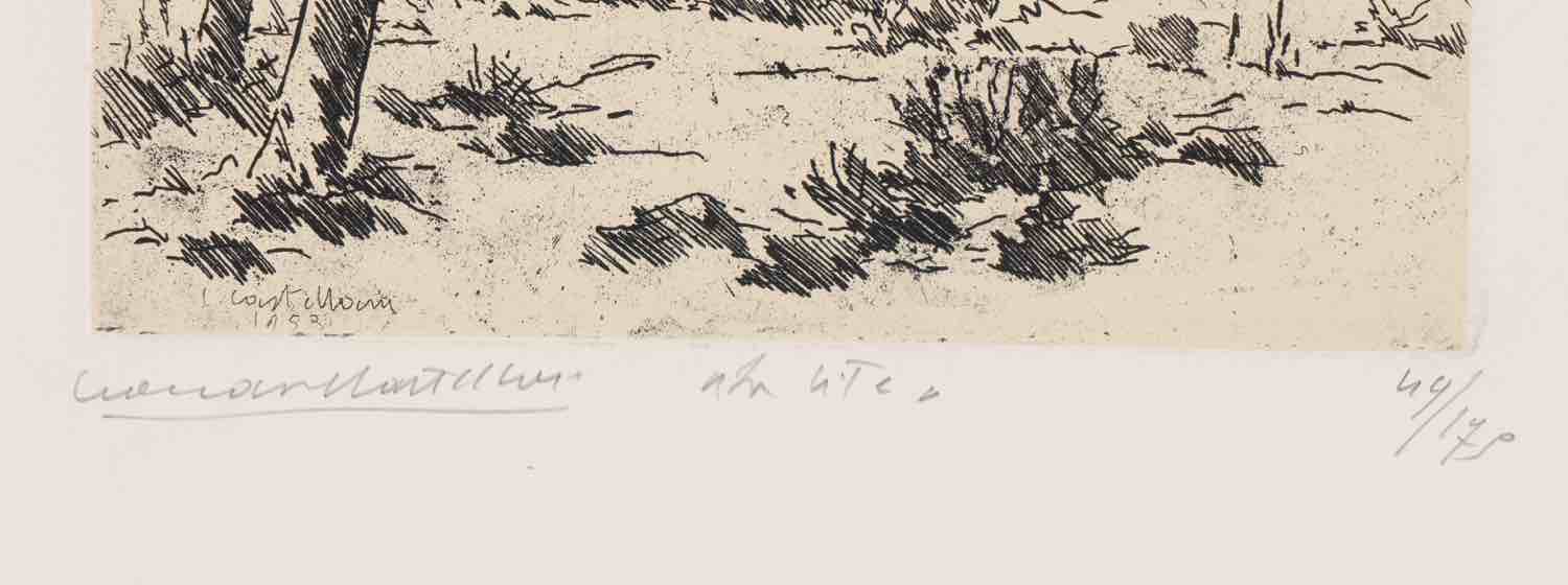 Litografia su carta, firmata e datata nella lastra “L. Castellani/1953”, firma in matita in basso a sinistra e numero di tiratura 49/179 in basso a destra, reca iscrizione in basso al centro, timbro a secco “Pergola Edizioni” e altro timbro a secco, Lastra H cm 31x21 – Foglio H cm 70x50