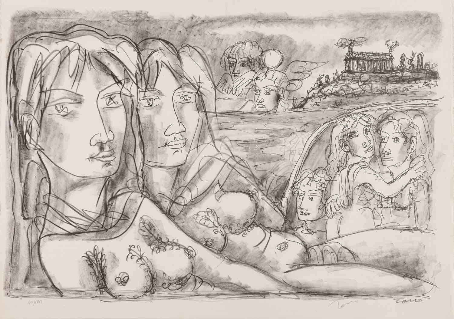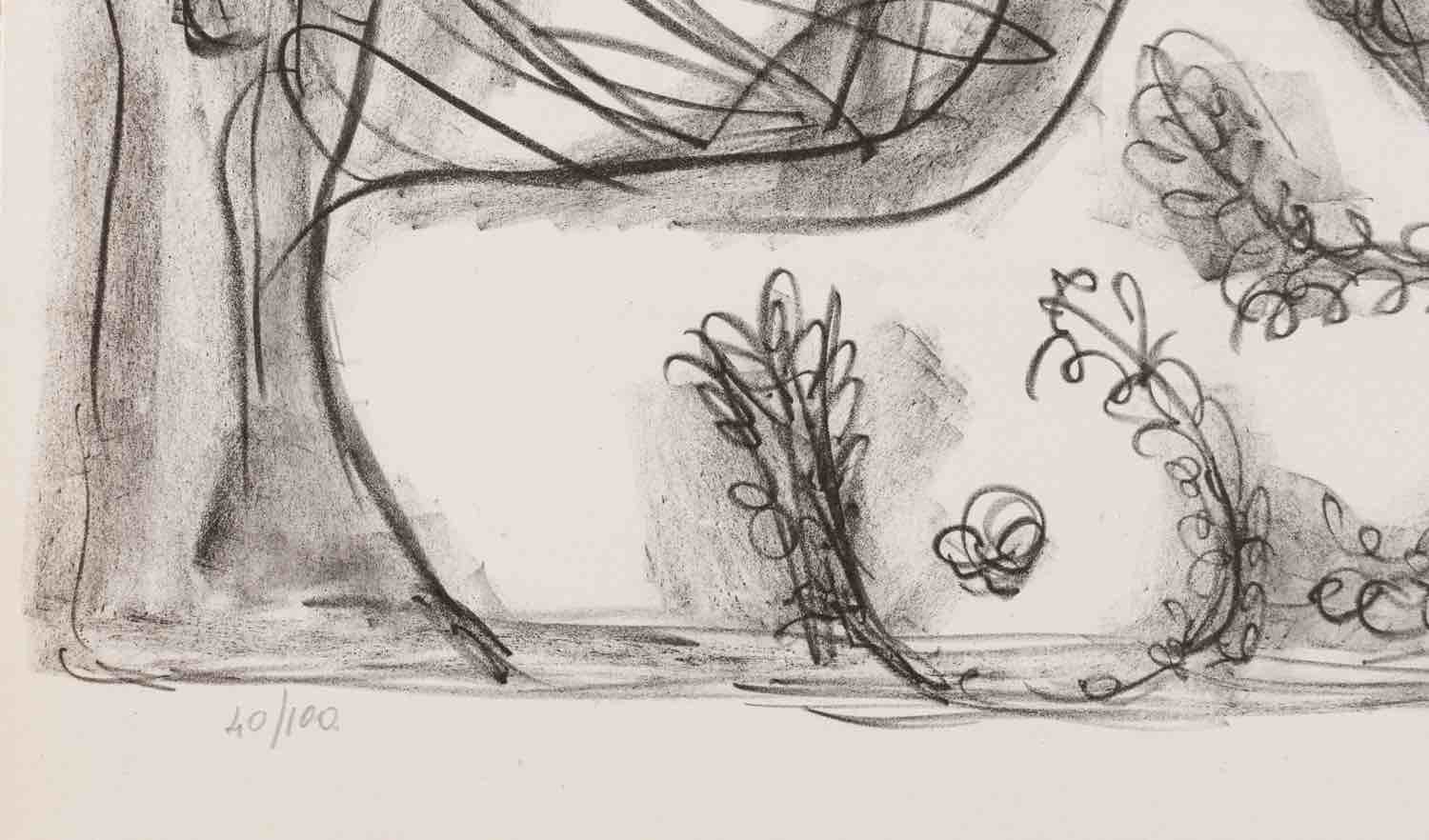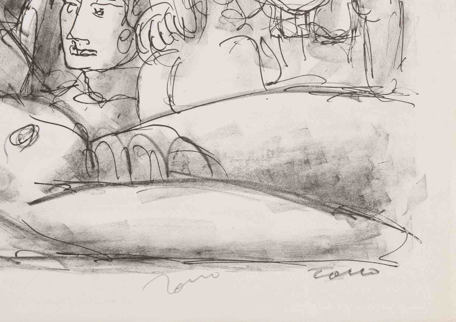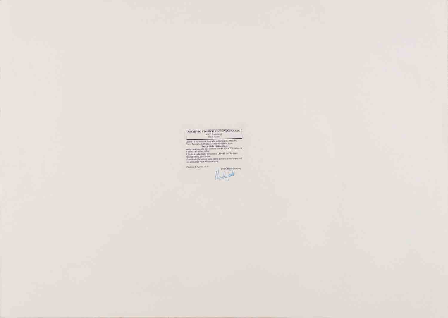 Litografia su carta, firmata nella lastra “Tono”, reca firma in basso a destra e numero di tiratura in basso a sinistra 40/100, al retro presenta etichetta dell’Archivio Storico Tono Zancanaro per autentica con firma del Professor Manlio Gaddi datata 8 Aprile 1990, Foglio H cm 50x70