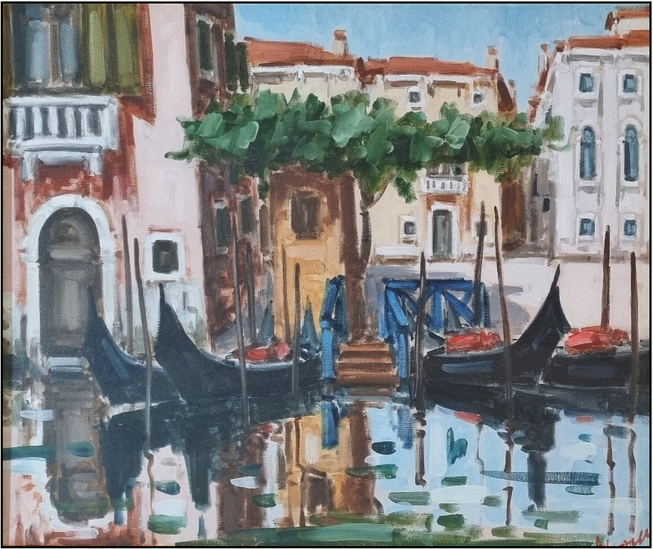 NOVELLO GIANCARLO Burano 1945 "Traghetto" olio su tela cm 60x50. Firmato sul fronte in basso a destra. Sul retro titolo e firma dell'autore per autentica.