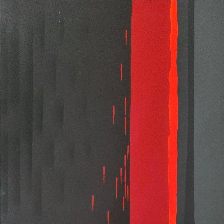 FINZI ENNIO Venezia 1931 "La solitudine del rosso" olio su tela cm 70x70. Sul retro firmato ed intitolato. Timbro per provenienza della Galleria "Il Castello di Adria". Autentica su foto a cura dell'artista.