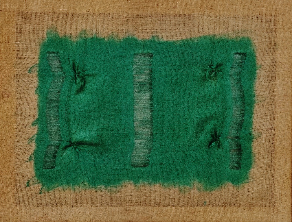 EMBLEMA SALVATORE Terzigno 1929-2006 "Senza titolo" terra colorata su tela di iuta cm 130x100 del 2001. Sul retro firmato e datato. Autentica ed archiviazione su foto a cura dell'artista.