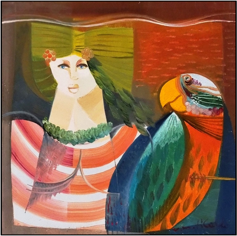 DI CARLO MARIO VITTORIO San Marco in Lamis (FG) 1939 - Milano 2015 "Figura con pappagallo" Olio su tela sabbiata cm 50x50. Firmato sul fronte in basso a destra. Al retro firma ed etichetta descrittiva con numero d'archivio.