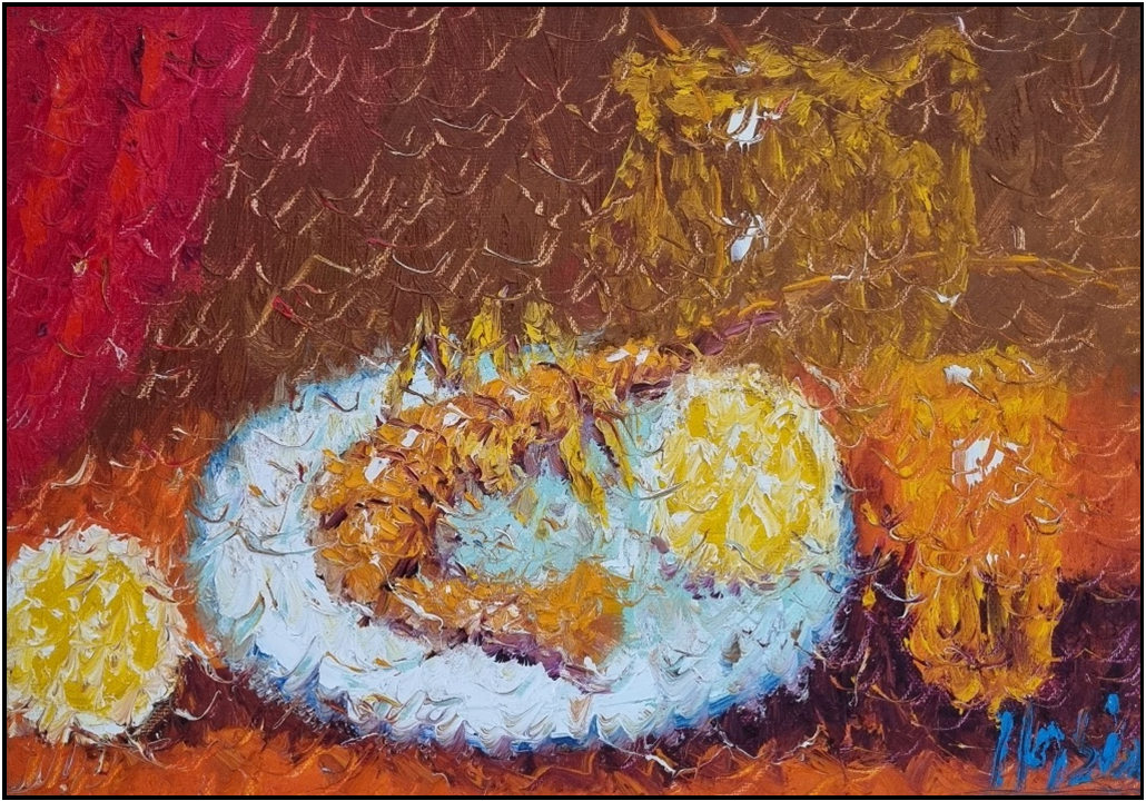 MASI ROBERTO Firenze 1940 - 2011 "Natura con aragosta" Olio su tela cm 35x25. Firmato sul fronte in basso a destra. Al retro firma, etichetta descrittiva e timbro per provenienza "Galleria Castello".