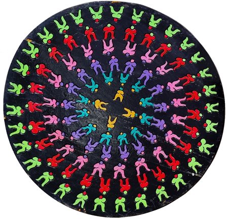 EMMETT WILLIAMS Greenville (SOUTH CAROLINA) 1925 - Berlino 2007 "The glorious day when all the little people in the whole wide world decided to be different" Colore, acrilici e flatting su legno inciso a mano, cm 80 di diametro e cm 2,2 di spessore, del 1990-1996. Sul retro etichetta descrittiva con firma dell'autore.