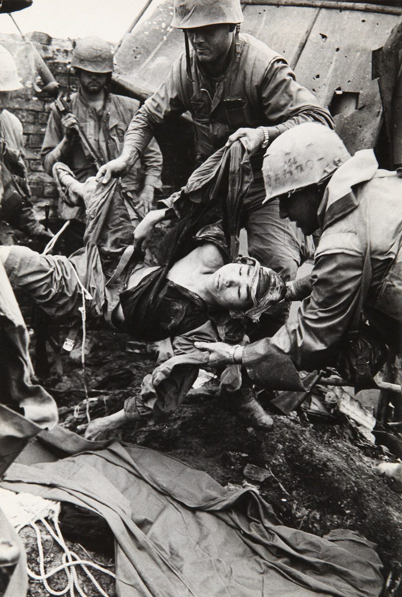 MC CULLIN DONALD (1935-) Vietnam del Nord - Hue 1968 stampa ai sali d'argento – vintage 30x20,5 cm timbro sul retro McCullin- Magnum letteratura: Don McCullin, edizioni Contrasto 2003, pag. 123 scritta a matita sul retro: "Un soldato vietnamita ferito, viene estratto dal suo bunker dai mar...
