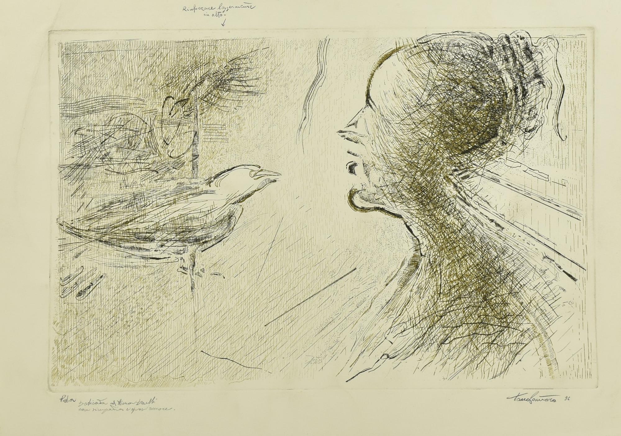 Ignoto PROFILO FEMMINILE E VOLATILE litografia su carta, cm 39x59, su foglio...