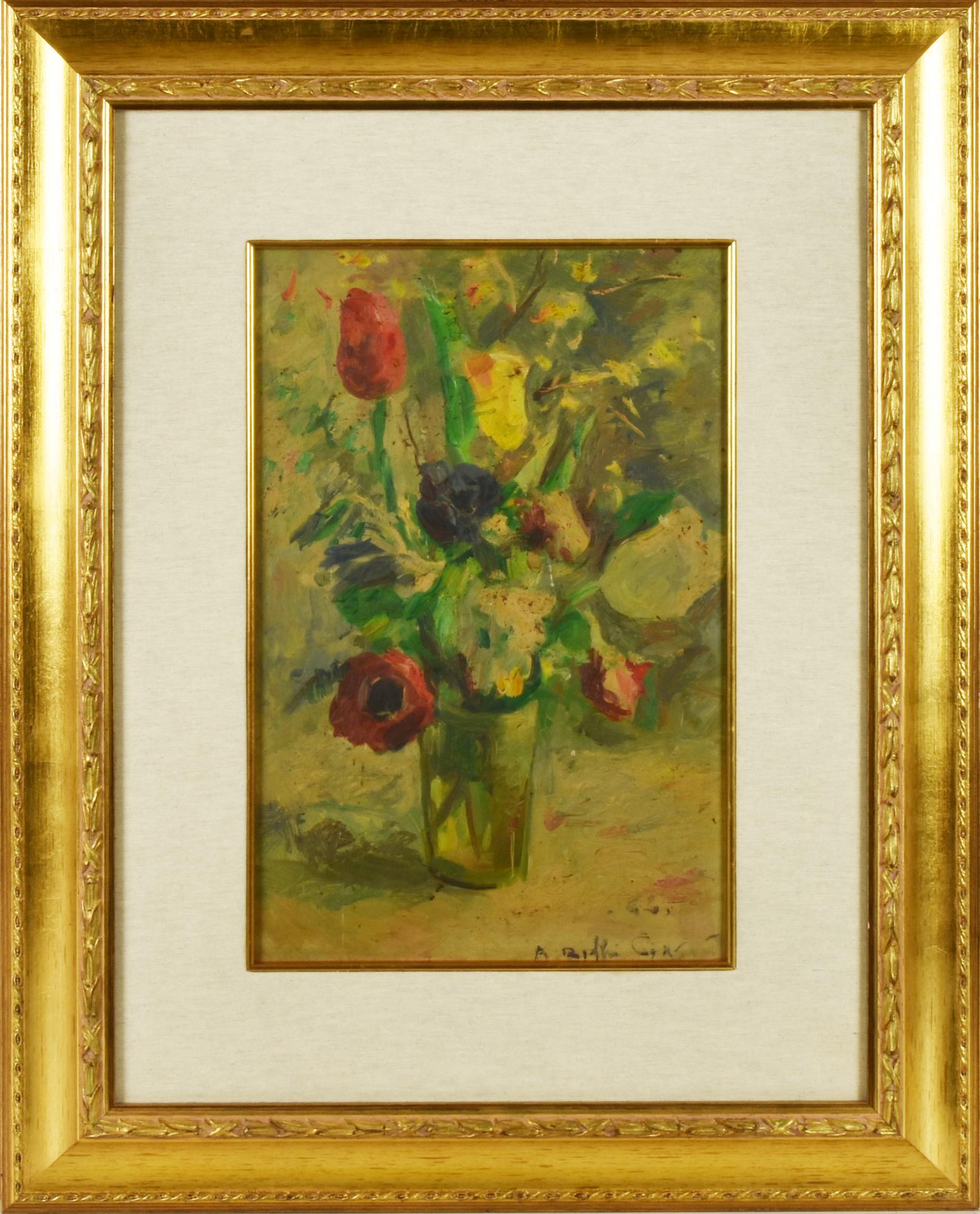 Ignoto VASO DI FIORI olio su tela applicata su faesite, cm 45x30,5 firma e...