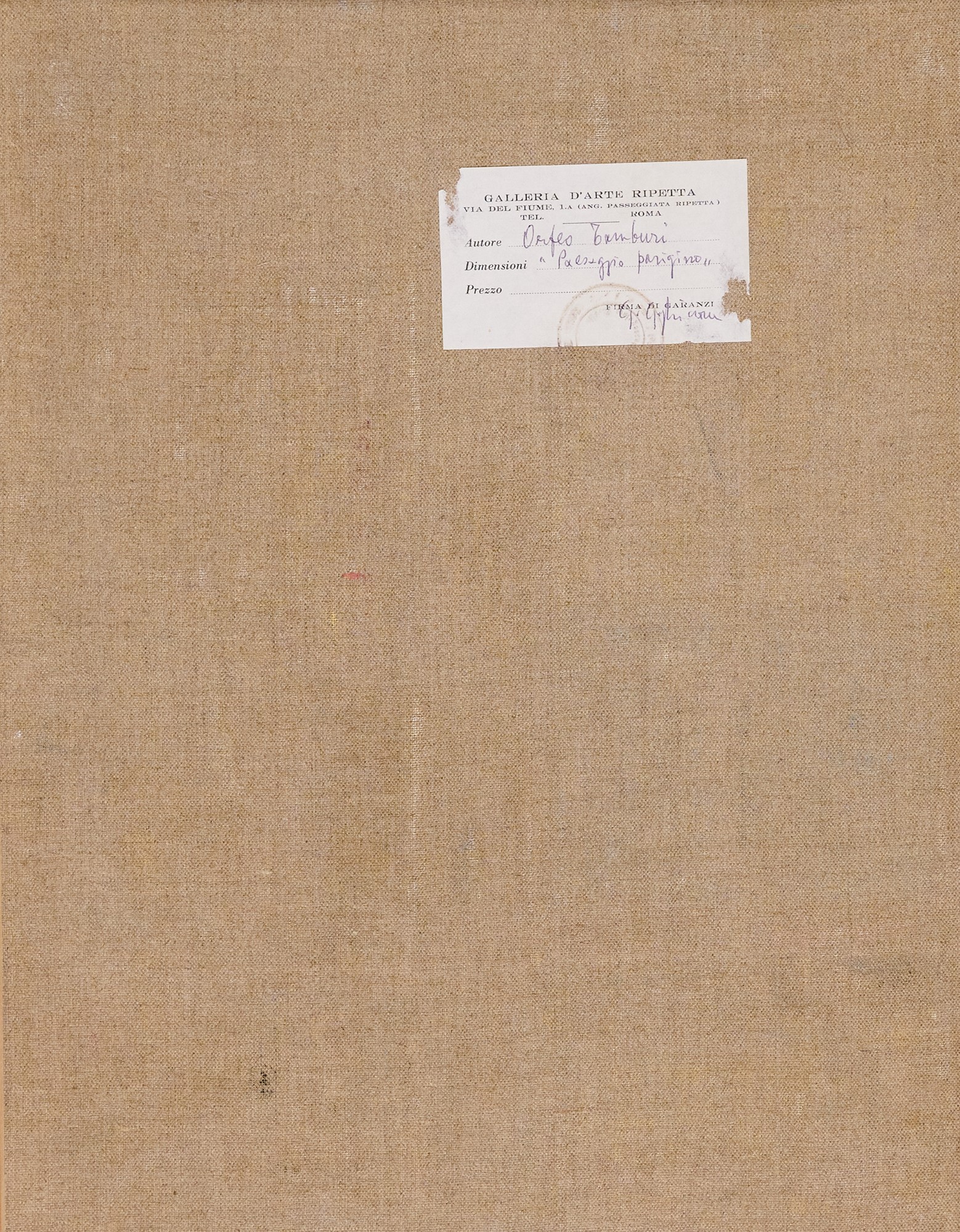 Sul verso: etichetta "Galleria d'Arte Ripetta", Roma, con timbro e descrizione.
