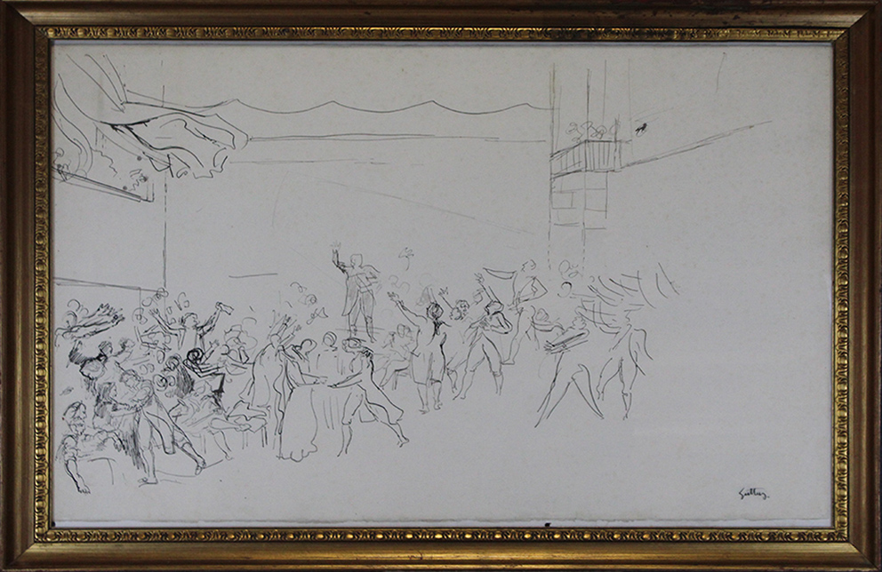 RENATO GUTTUSO, "Bozzetto teatrale per Il tenore sconfitto, Teatro Eliseo Roma", 1950, China su cartoncino, Dim. 69x101, Al fronte: firmata in basso a destra, Opera accompagnata da autentica su foto dell'artista, Opera archiviata presso Archivi Guttuso, Opera con cornice