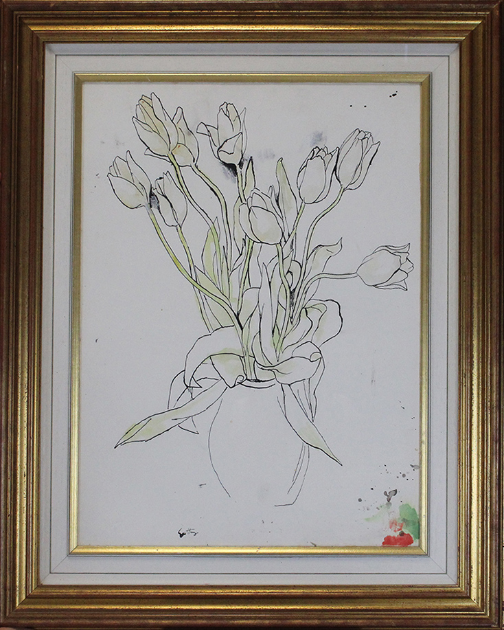 RENATO GUTTUSO, "Tulipani", 1978, China, acquerello e lumeggiature di acrilico su cartoncino incollato su tela, Dim. 71.5x52.5, Al fronte: firmata in basso a sinistra, Opera accompagnata da autentica su foto dell'artista, Opera archiviata presso Archivi Guttuso, Opera con cornice