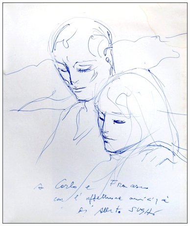 ALBERTO SUGHI Cesena 1928 – Bologna 2012 Senza titolo Penna su carta 29 x 23,8. Dedica e firma in b. a d. L’opera è stata realizzata da Sughi nella pagina bianca sottocopertina del catalogo di mostra “Sughi – Mostra antologica - 56° Premio Letterario Viareggio” a cura di Dario Micacchi e Antonio Marotta, Palazzo Paolina, Viareggio, 28 giugno – 28 luglio 1985, Editore Arti Grafiche Salafia, Capua.