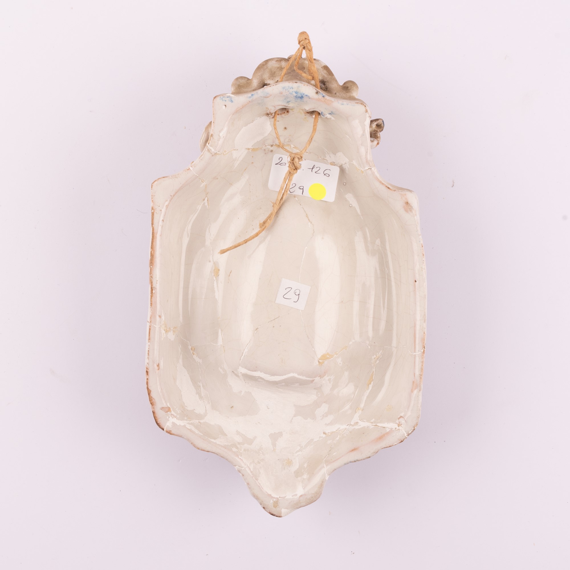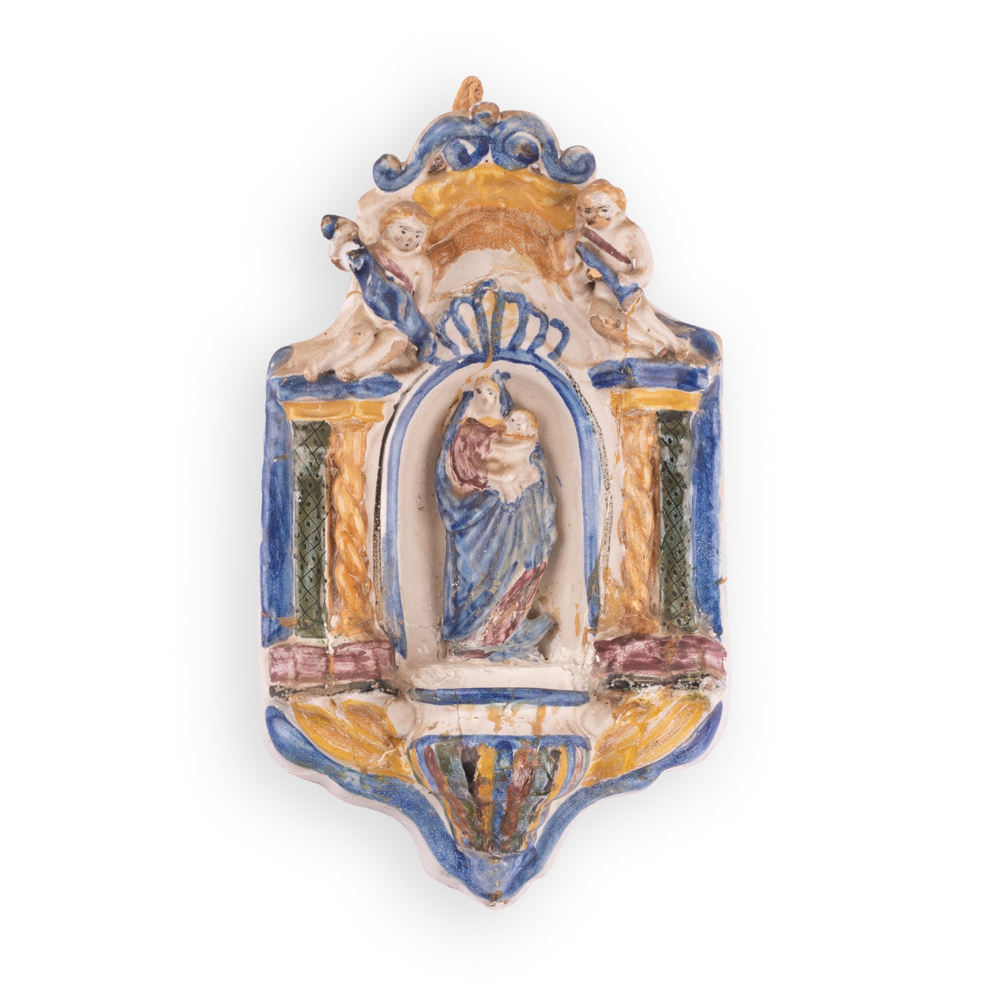 Lotto 12 | Manifattura castellana attiva tra la fine del XVIII e la prima metà del XIX secolo ( - ) Acquasantiera in maiolica decorata con elementi a rilievo e con l'immagine della Madonna con il Bambino, nell'edicola centrale. cm 26x15
