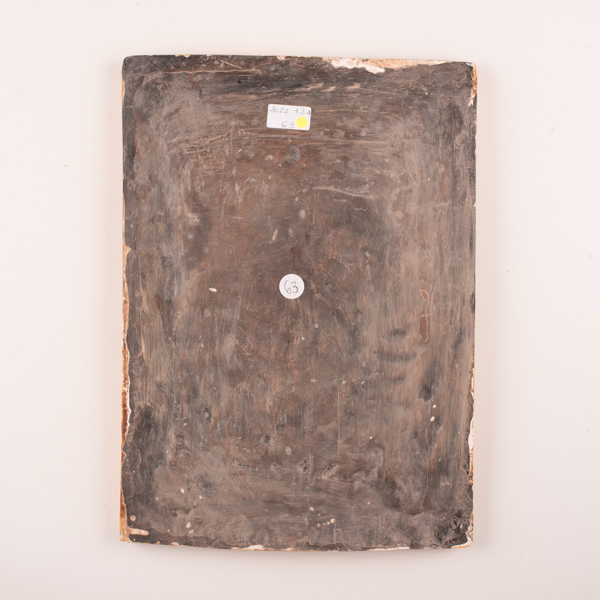Placca devozionale in maiolica policroma con la rappresentazione della Madonna del Rosario con il Bambino, Sant'Antonio da Padova e San Francesco