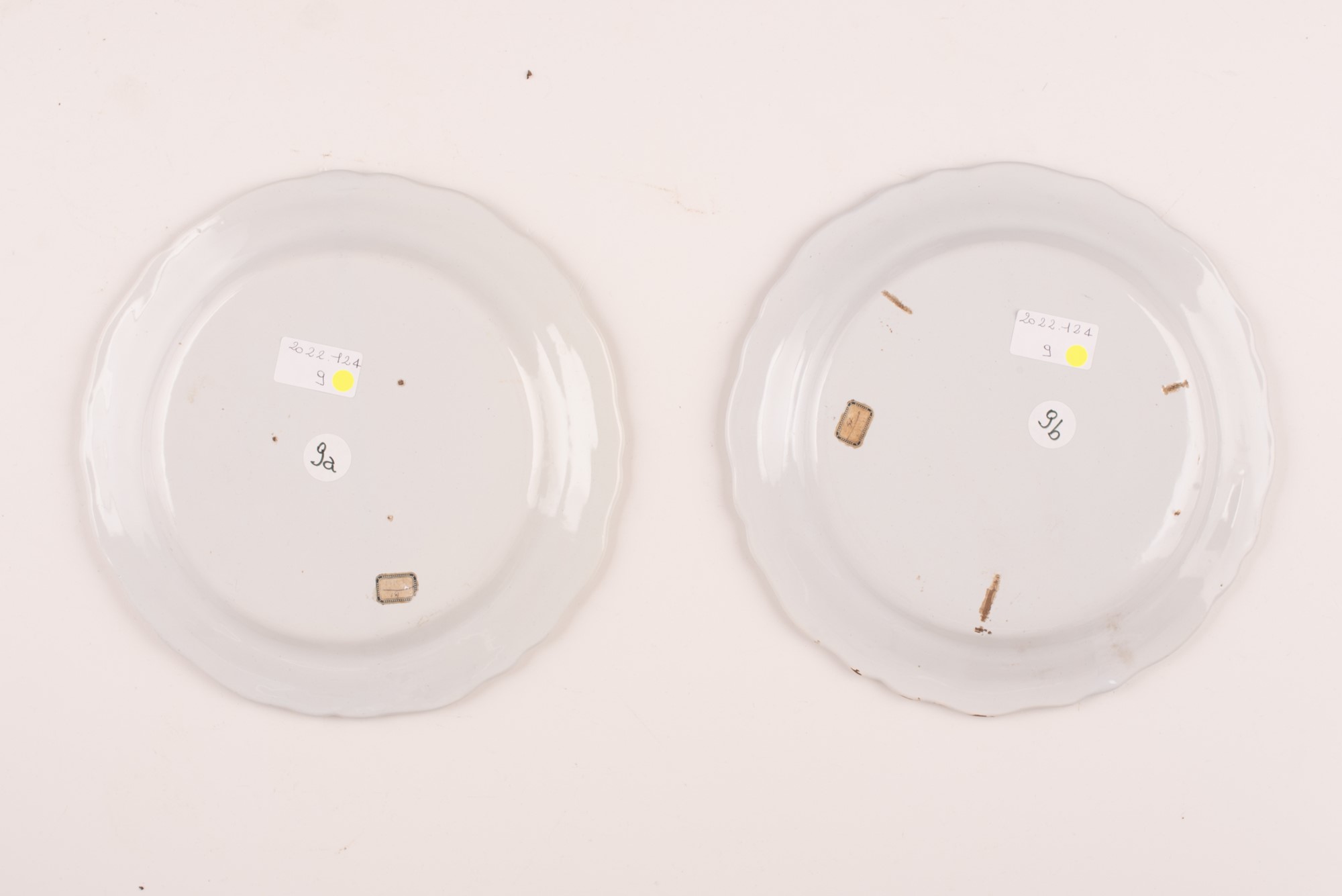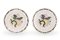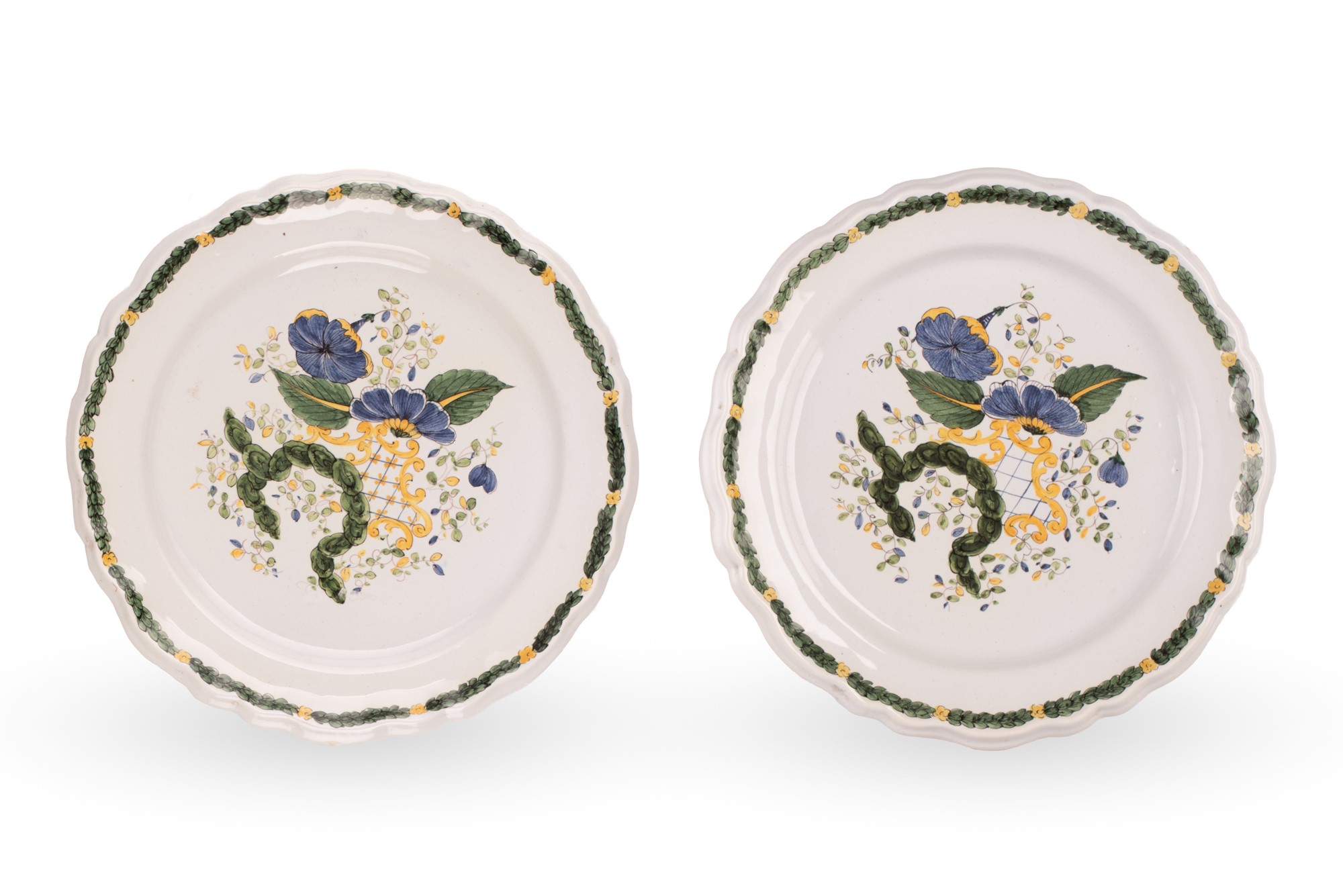 Coppia di piatti decorati a motivi floreali ed elementi rocaille nei toni del verde, blu e giallo. XVIII secolo