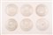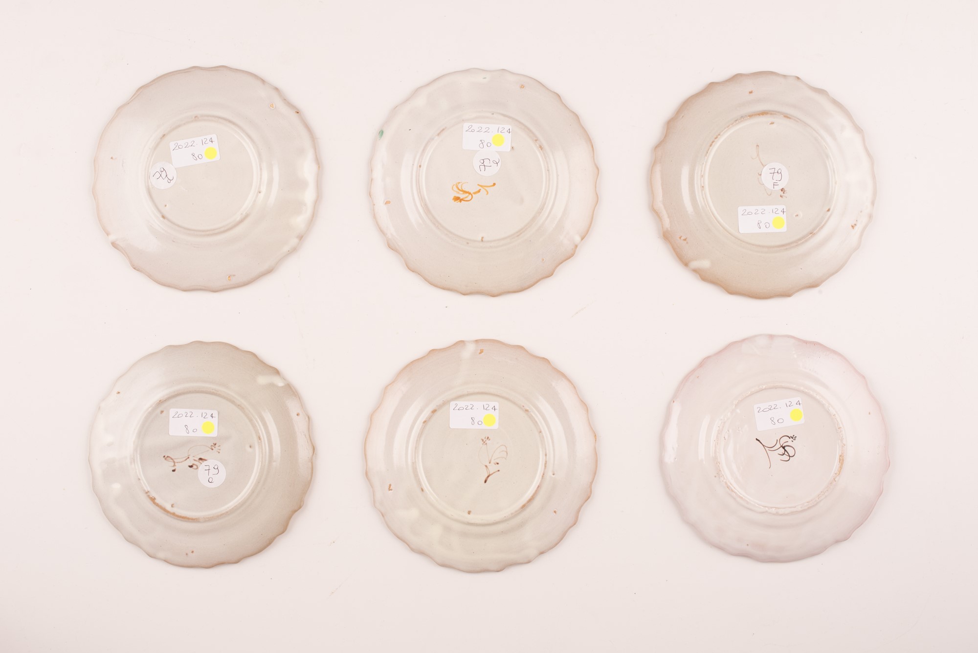 6 piattini in maiolica a bordo mistilineo, decorati in policromia con il tipico motivo a "tacchiolo"