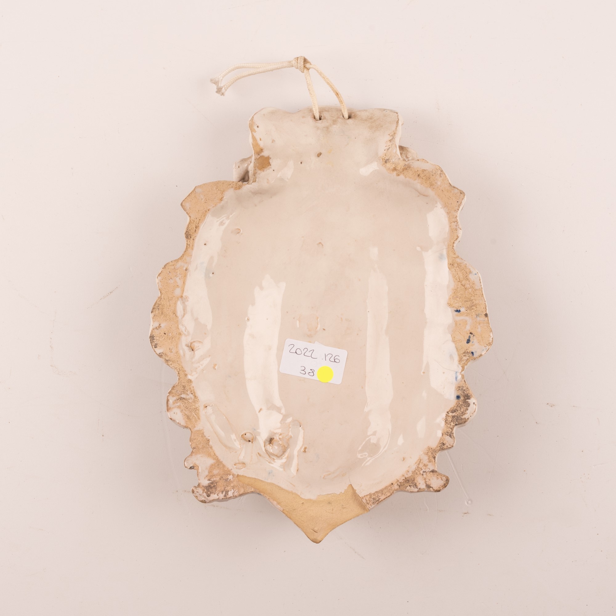 Manifattura castellana della seconda metà del XVIII secolo ( - ) Acquasantiera in maiolica con decorazioni a rilievo recante al centro l'effigie di Cristo Risorto in atto benedicente. cm 27,3x21