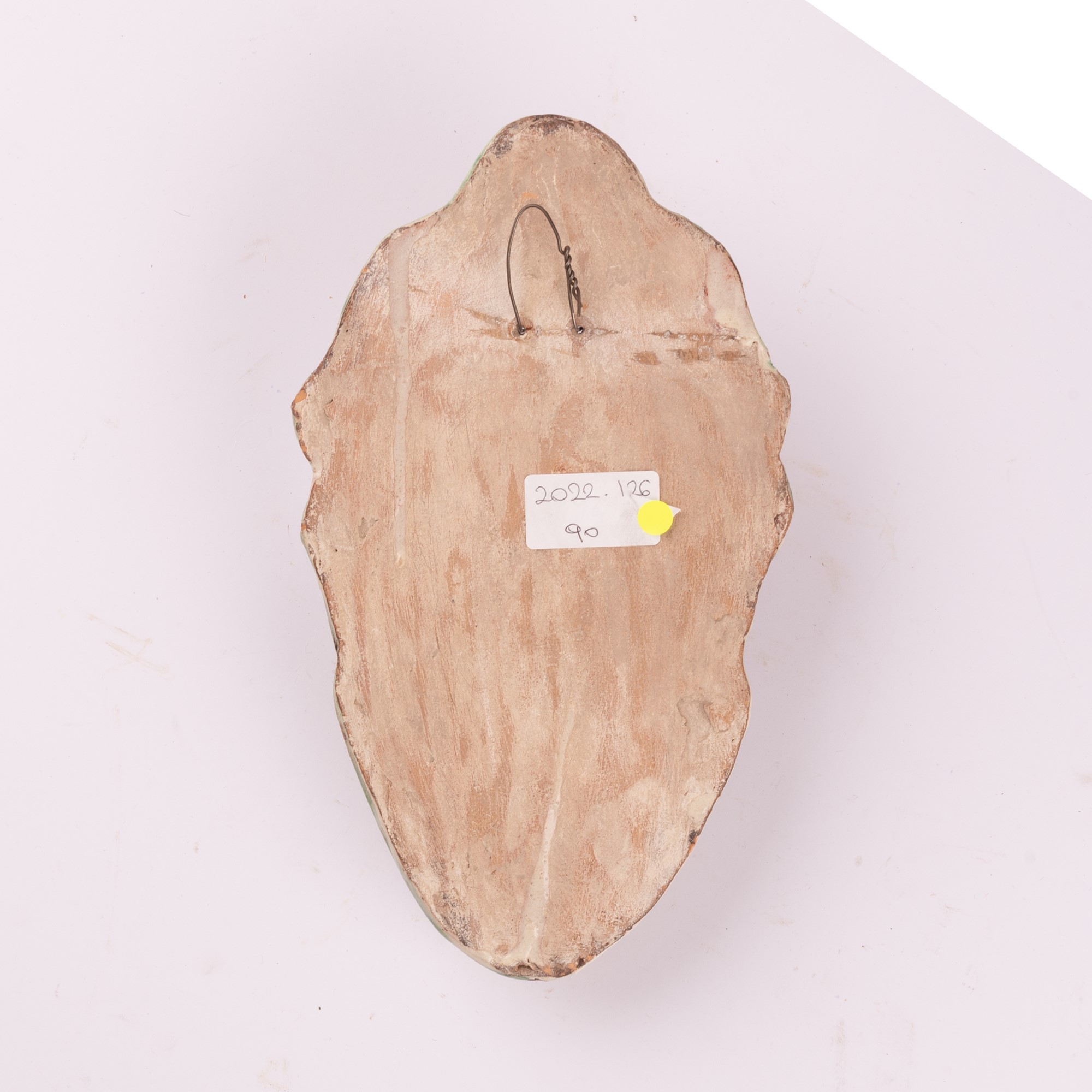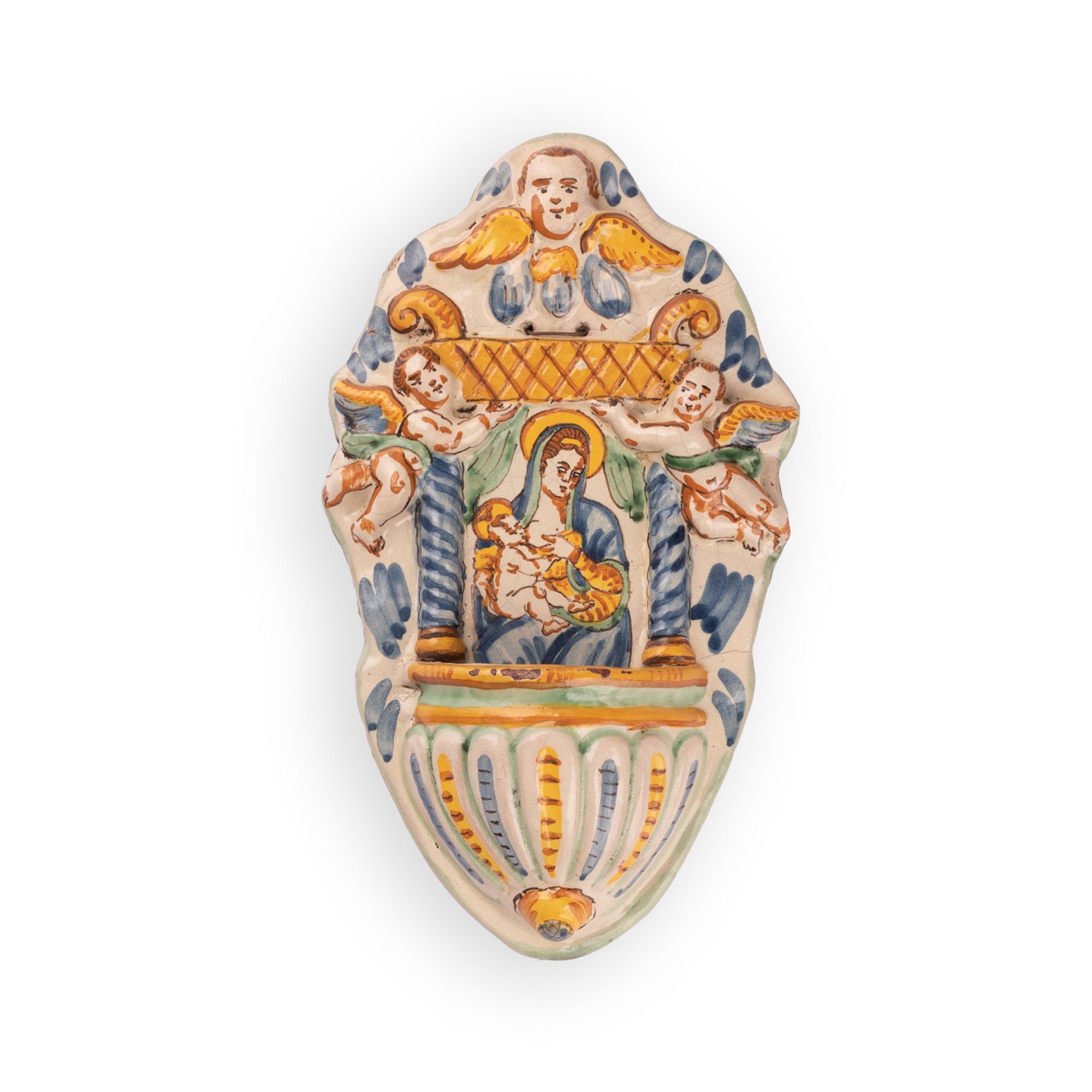 Manifattura di Cerreto Sannita attiva nel XVIII secolo ( - ) Acquasantiera in maiolica decorata con elementi a rilievo e con l'effigie della Madonna con il Bambino nell'edicola centrale cm 25x14