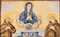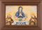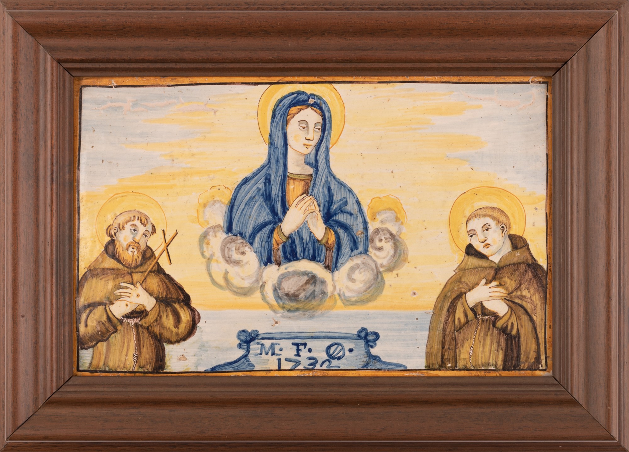 Mattonella maiolicata raffigurante la Vergine Maria tra i Santi Francesco d'Assisi e Antonio da Padova.